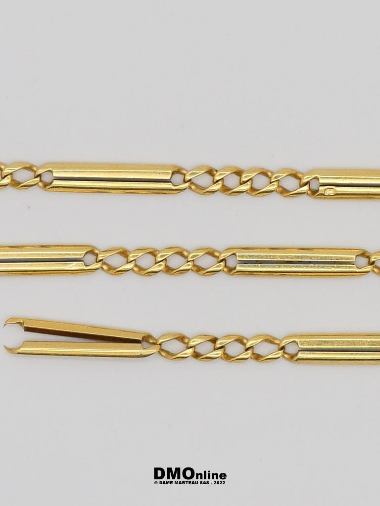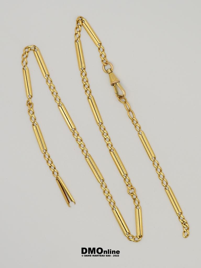Chaine giletière accidentée en or jaune 18k. Longueur : 49 cm. Poids : 21,58 gr