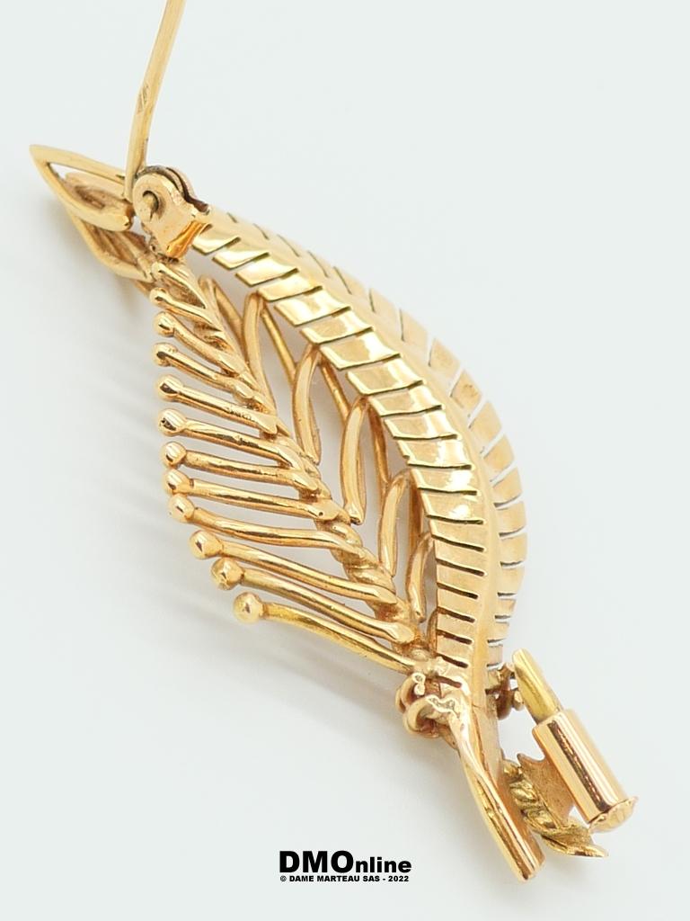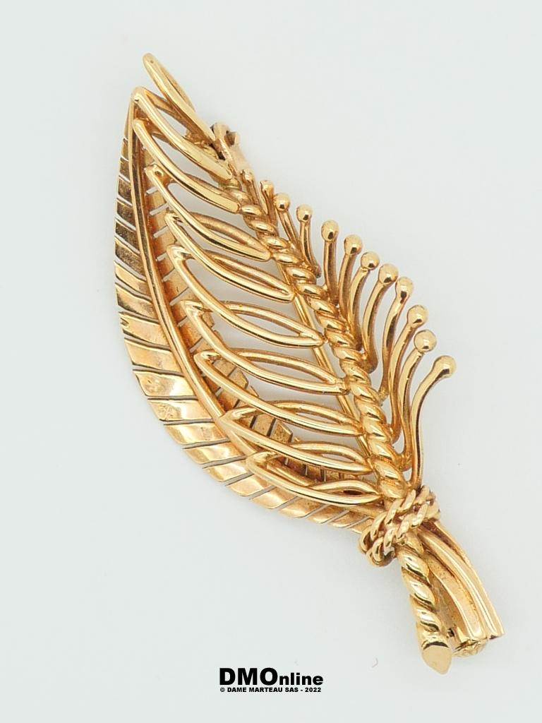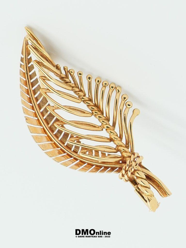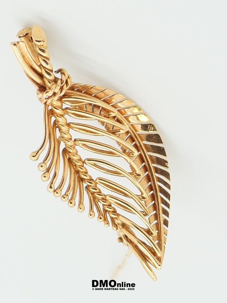 Broche feuille en or jaune 18k. Dimensions : 5,5×2,5 cm. Poids : 9,15 gr
