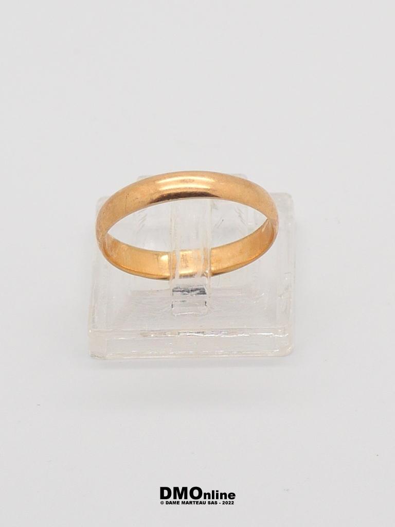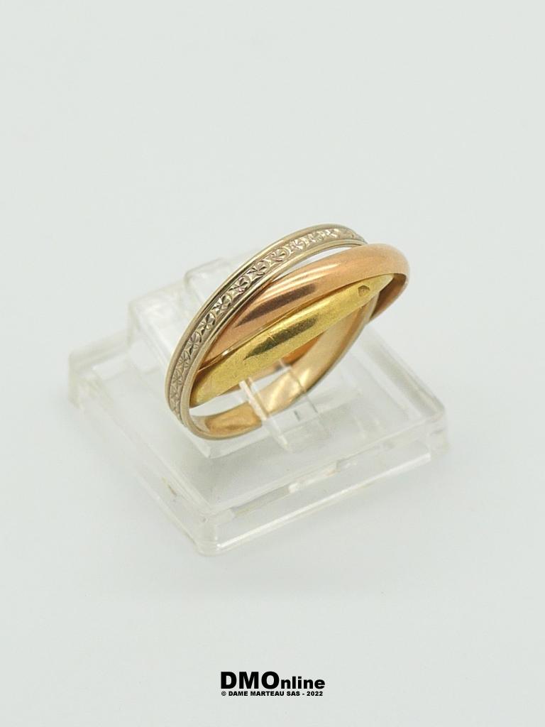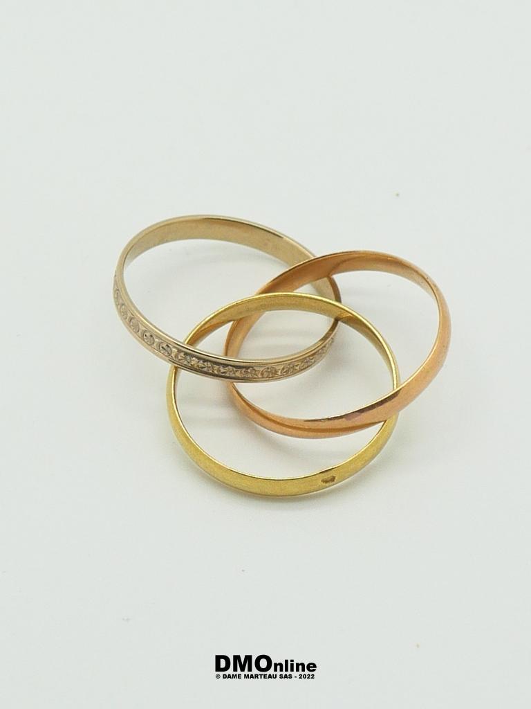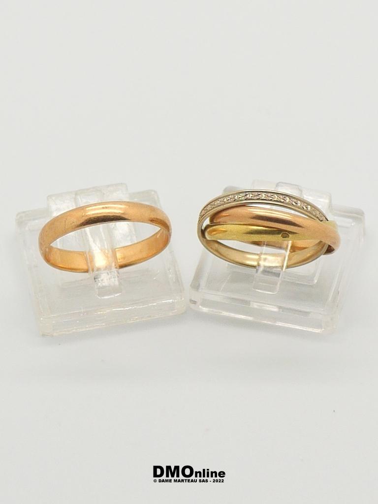 Deux alliances en or 18k dont une formée de trois anneaux dont un ornée de pierres. Poids total brut : 6,05 gr