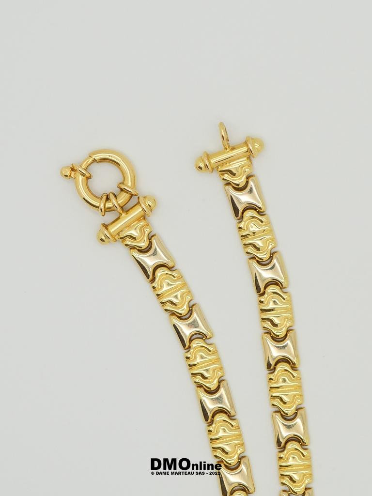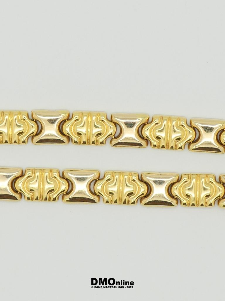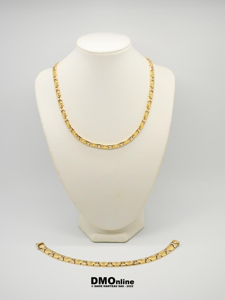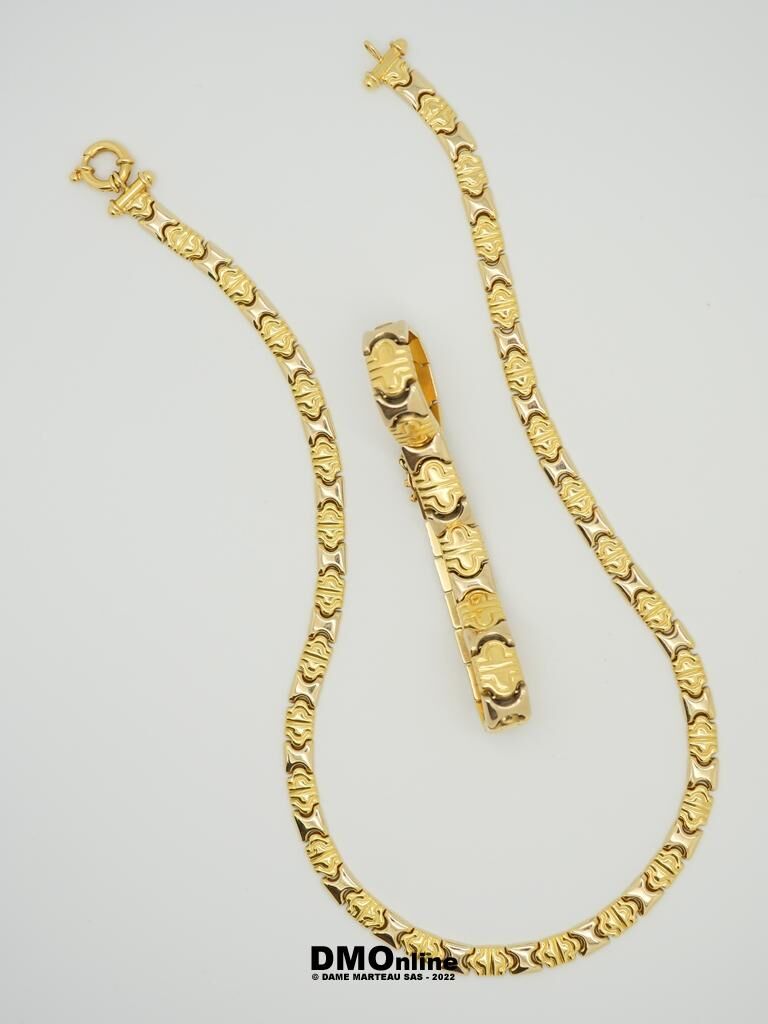 Parure en or jaune 18k comprenant un collier et un bracelet à maille articulée. Longueur : 43 cm et 19,5 cm. Poids total : 45,84 gr