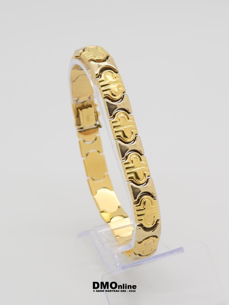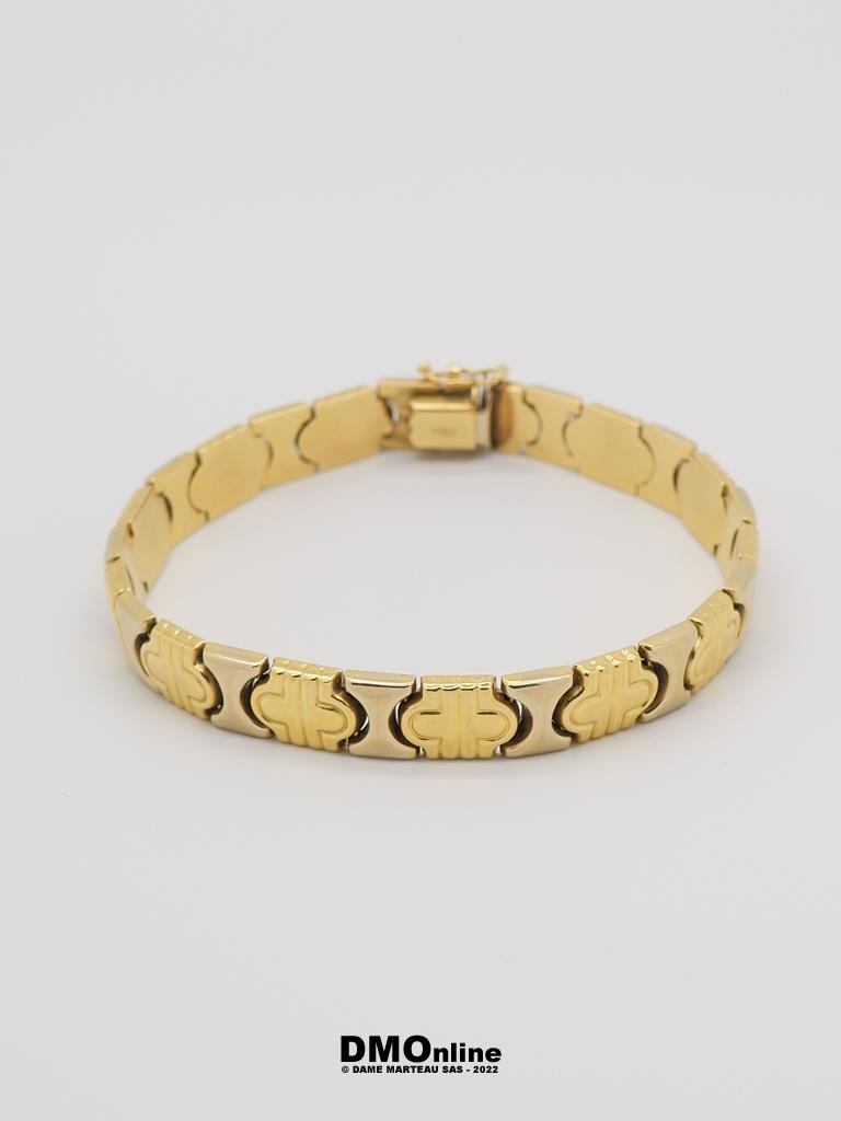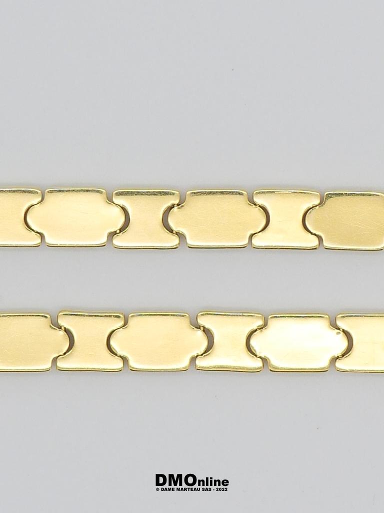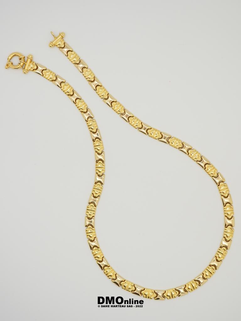 Parure en or jaune 18k comprenant un collier et un bracelet à maille articulée. Longueur : 43 cm et 19,5 cm. Poids total : 45,84 gr