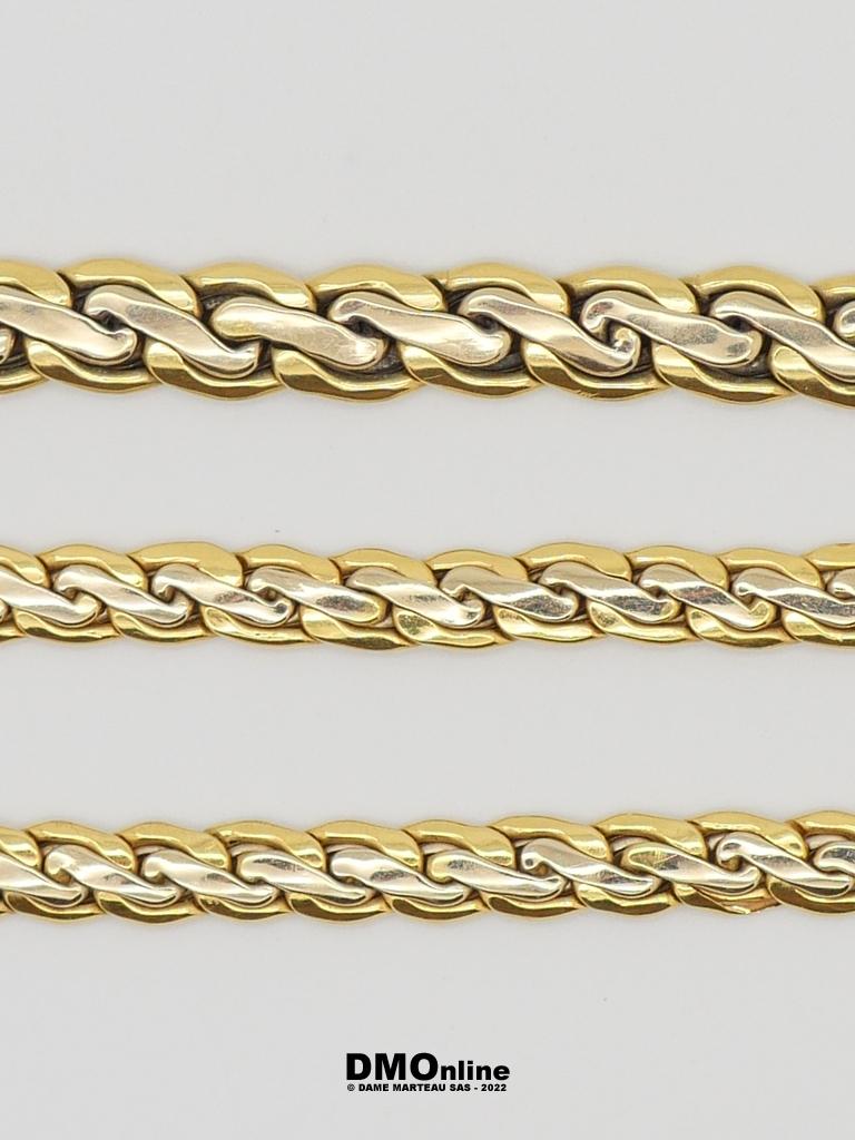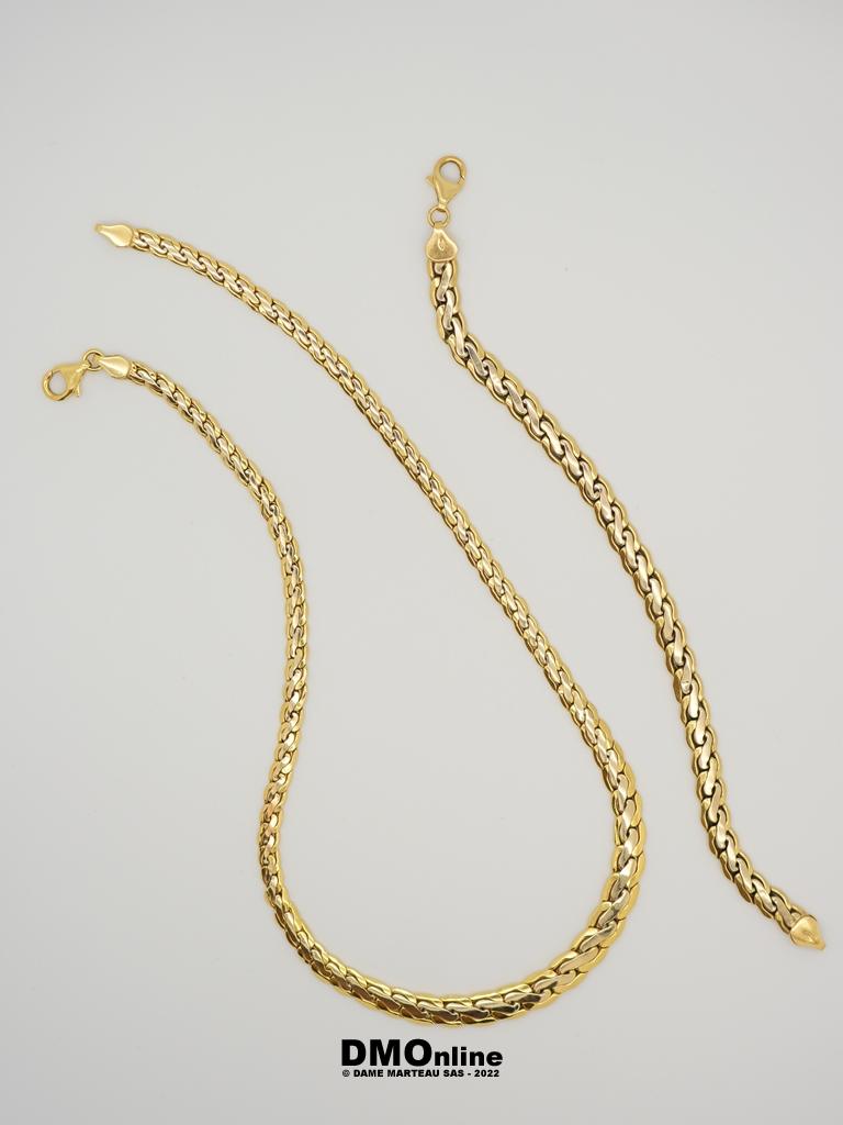 Parure en or jaune 18k comprenant un collier en chute et un bracelet. Longueur : 44 cm et 19,5 cm. Poids : 26,37 gr