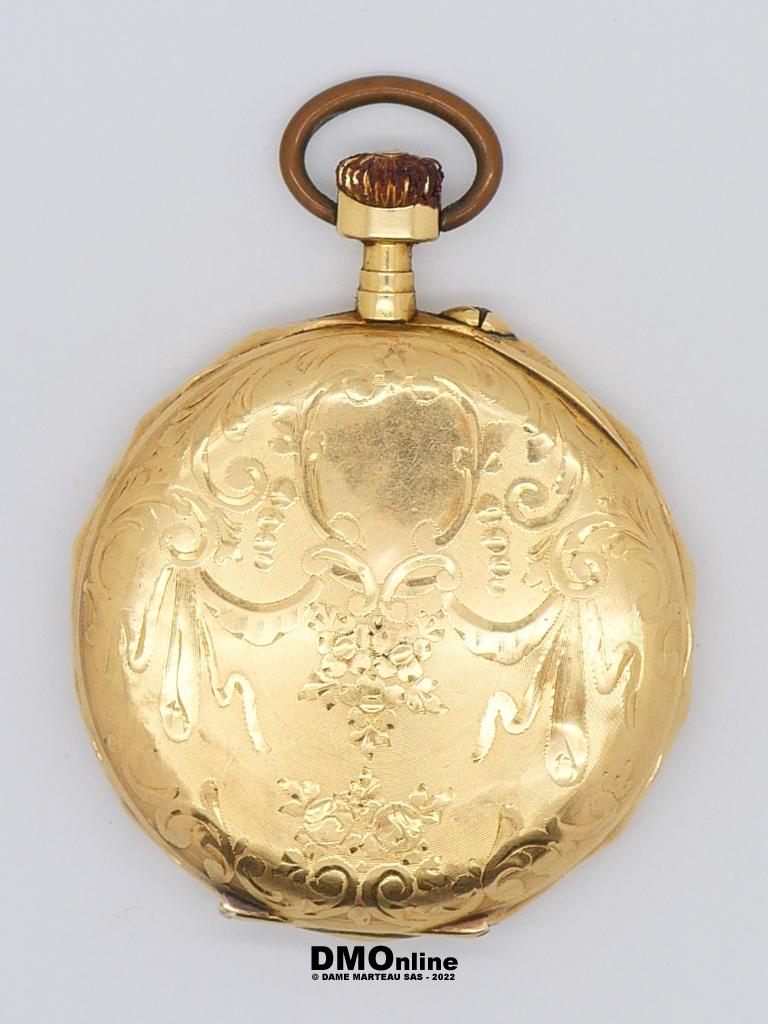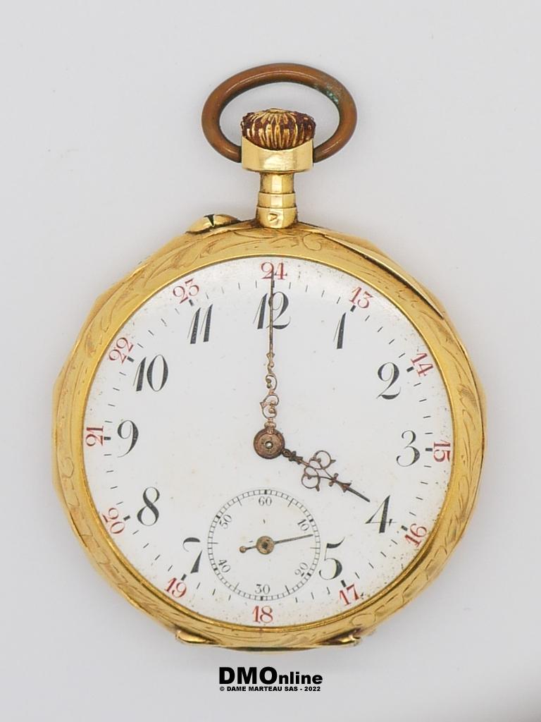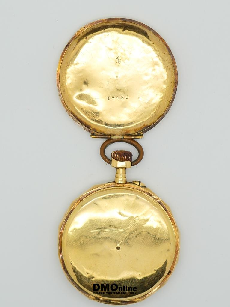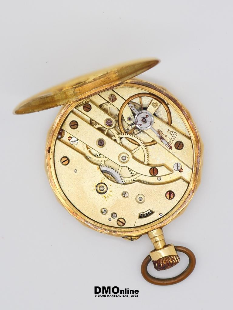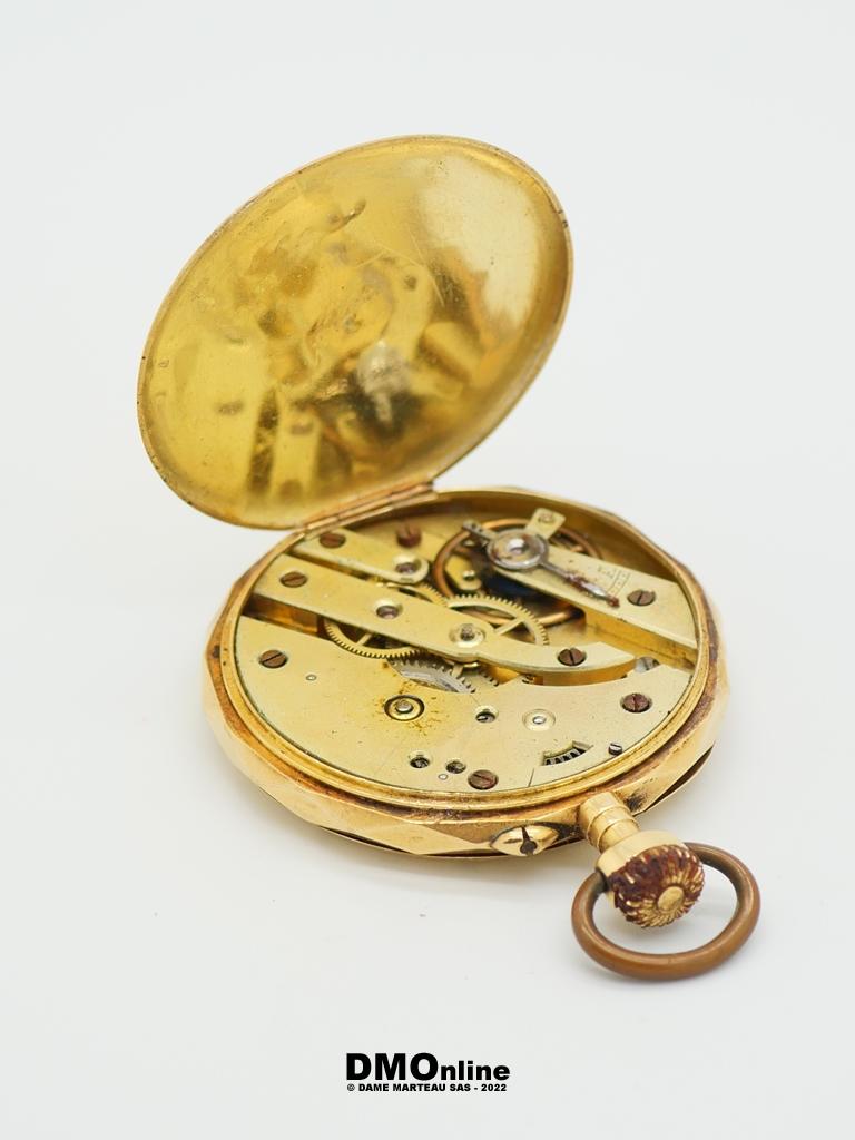 Montre gousset accidentée en or jaune 18k à double clapet en or. Bélière et remontoir en métal. Sans verre. Diamètre : 4,5 cm. Poids brut : 54,91 gr