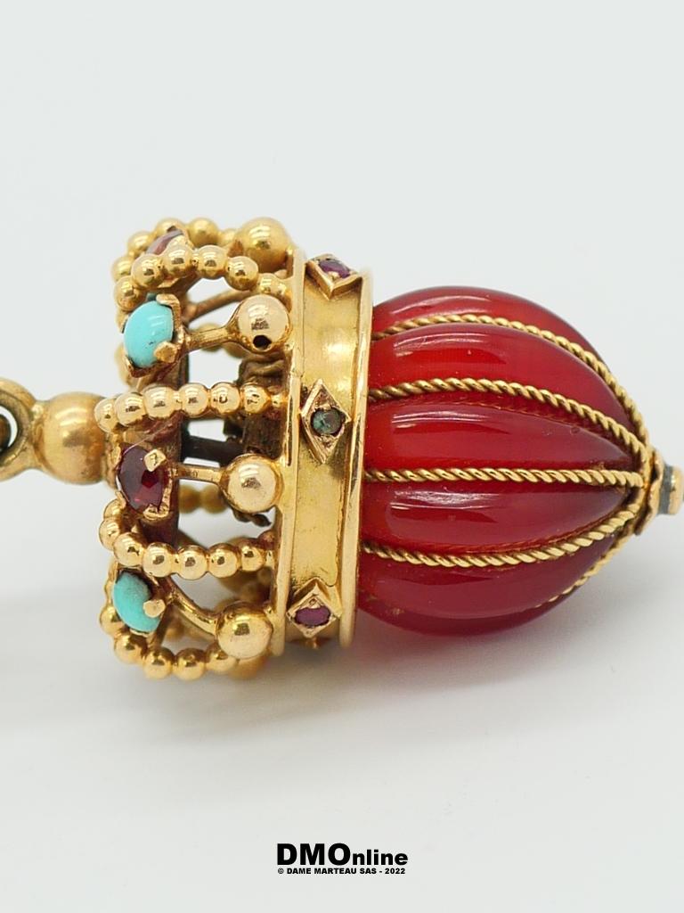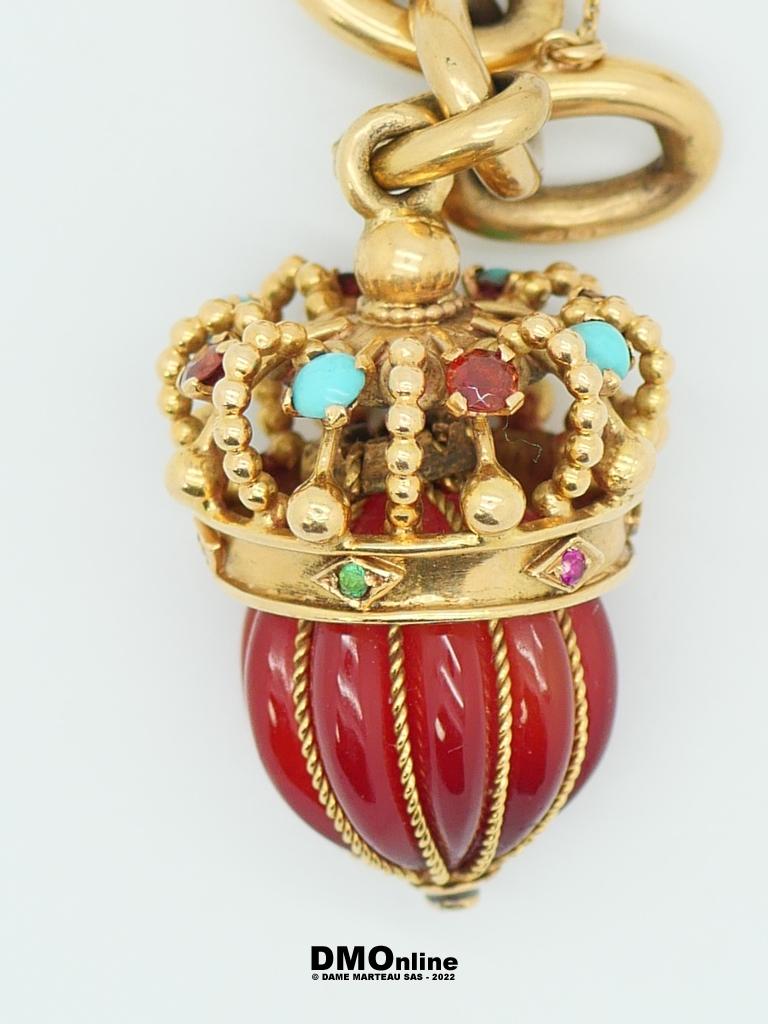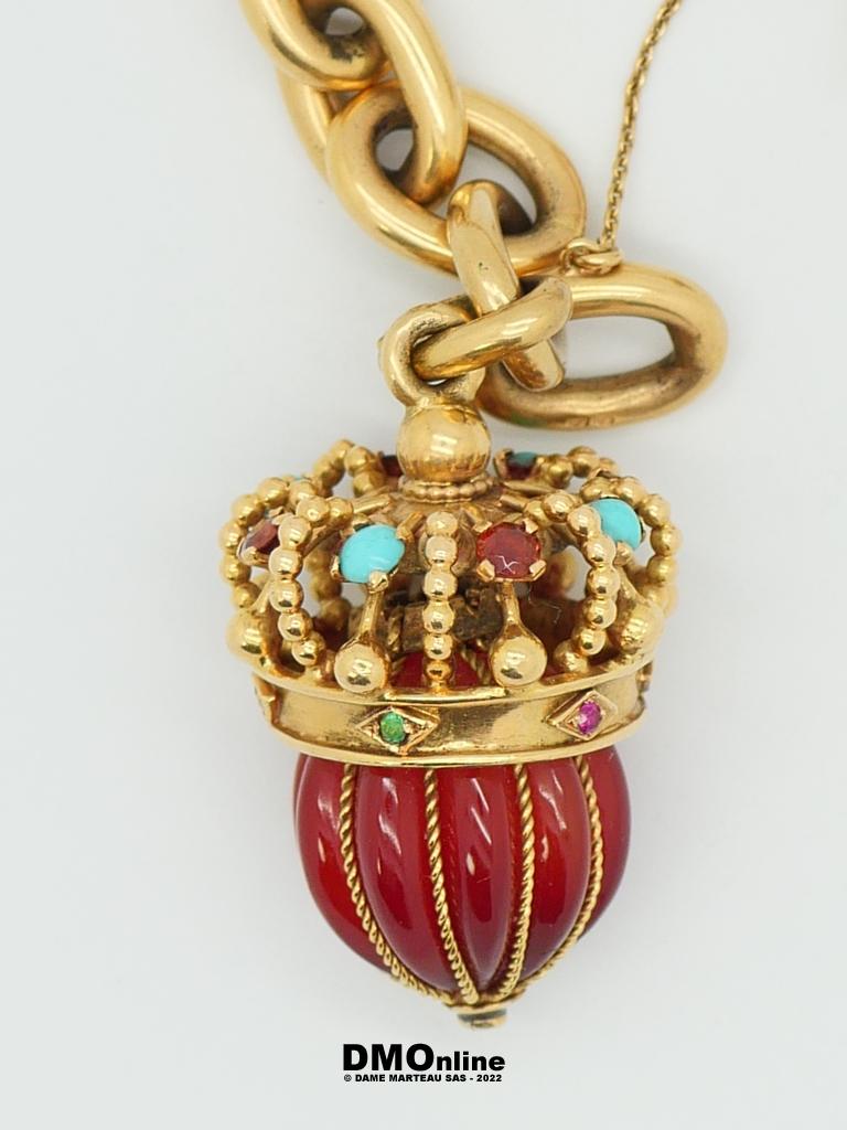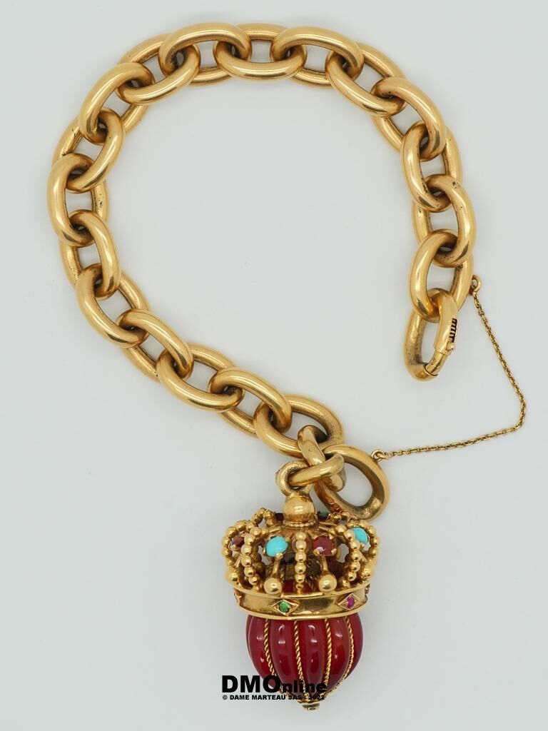 Bracelet en or jaune 18 à grosses mailles forçat rondes avec sa pendeloque à représentation d’une couronne en or et pierres. Poids brut : 48,81 gr