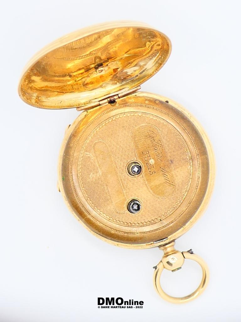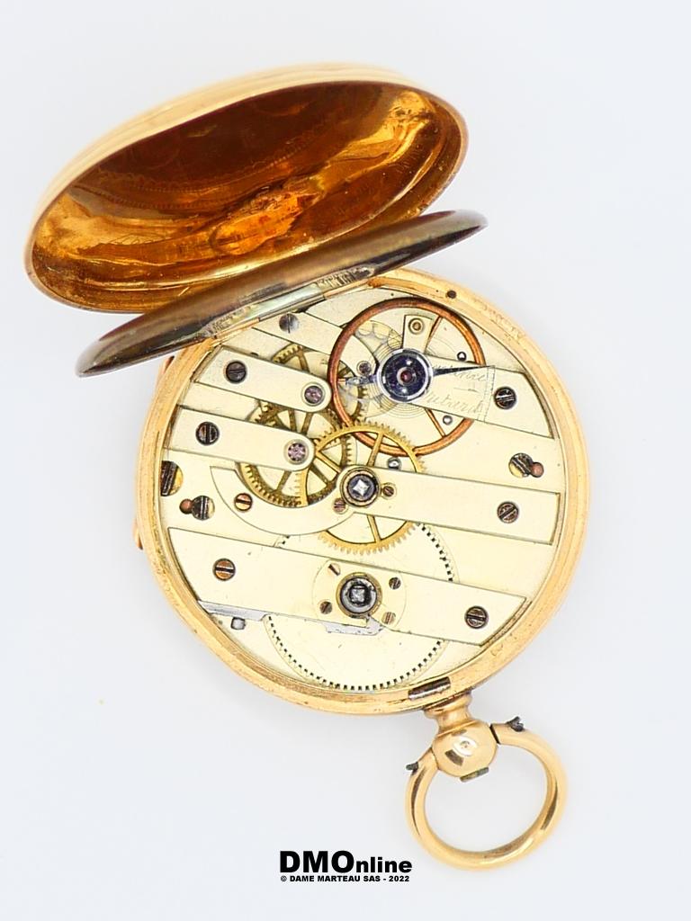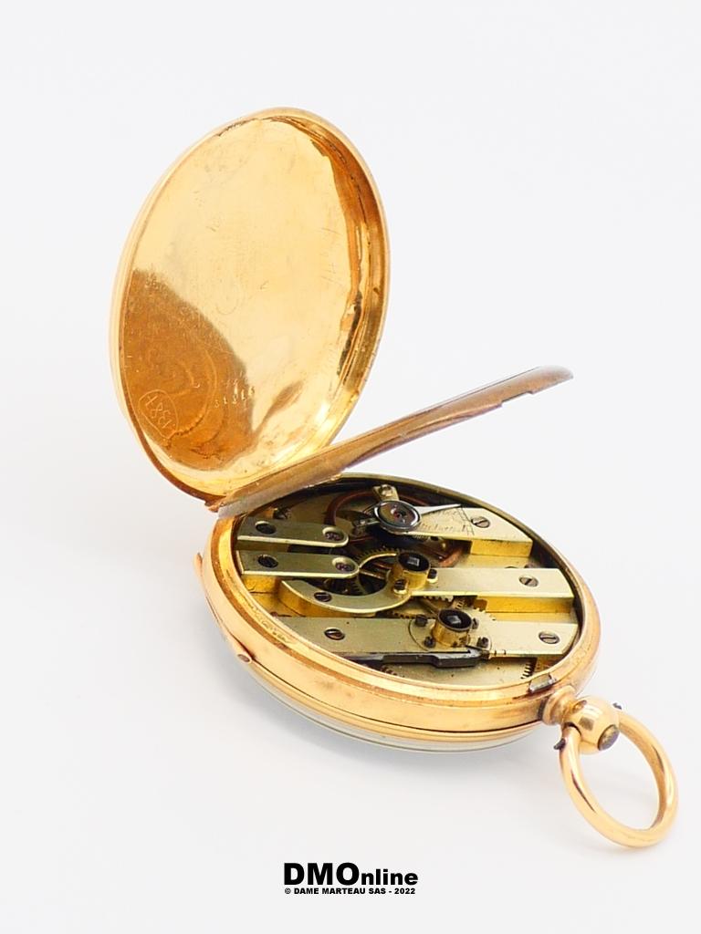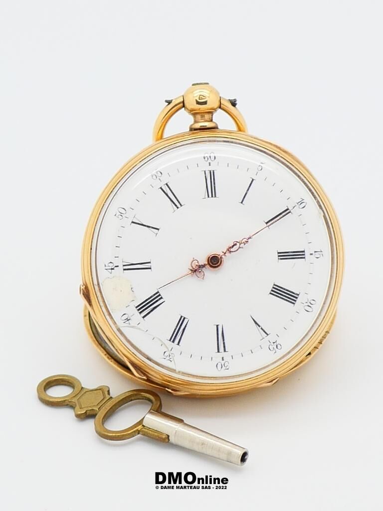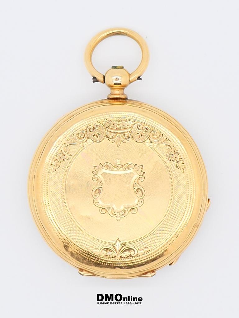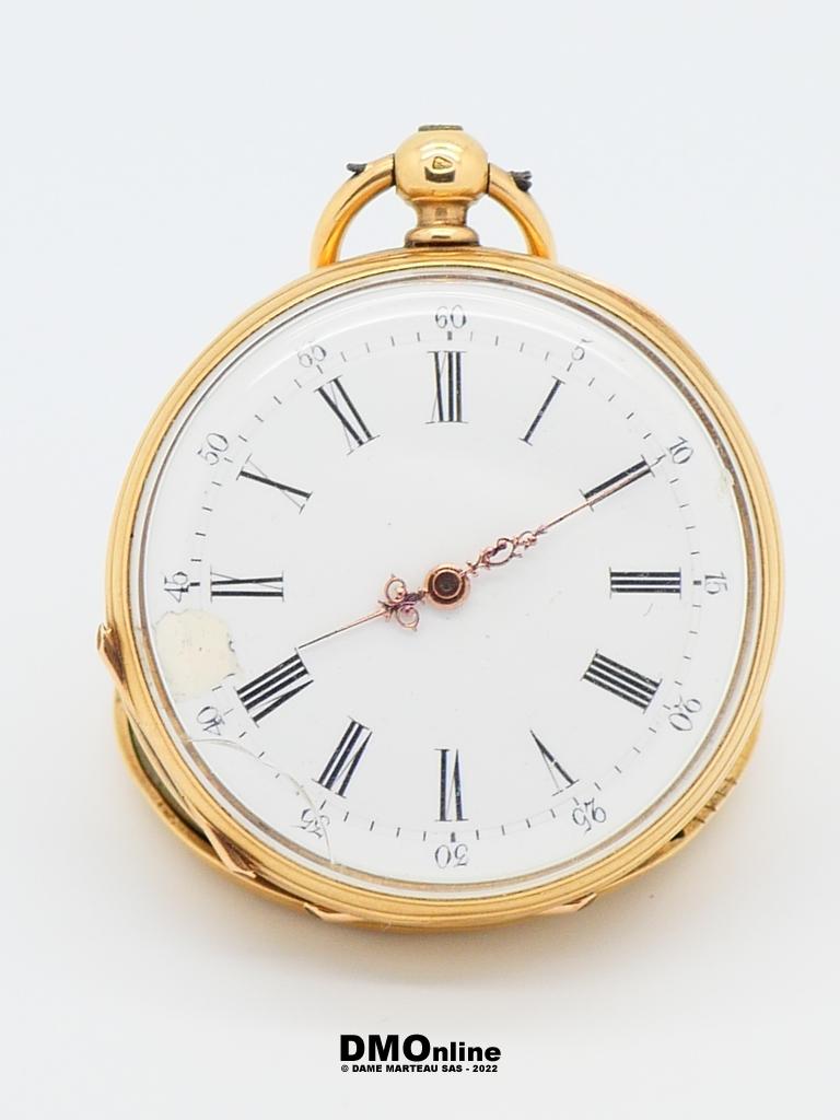 Montre gousset en or jaune 18k à clapet intérieur en métal. Verre cassé. Diamètre : 3,7 cm. Poids brut : 34,86 gr. Sans garantie de fonctionnement.