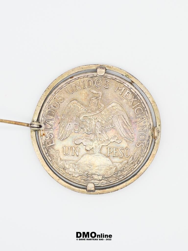 Pièce mexicaine en argent d’un peso de 1913 montée en broche. Diamètre total : 4,3 cm. Poids : 33,87 gr