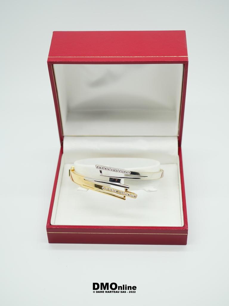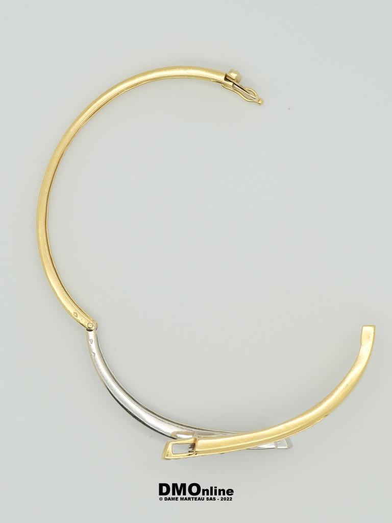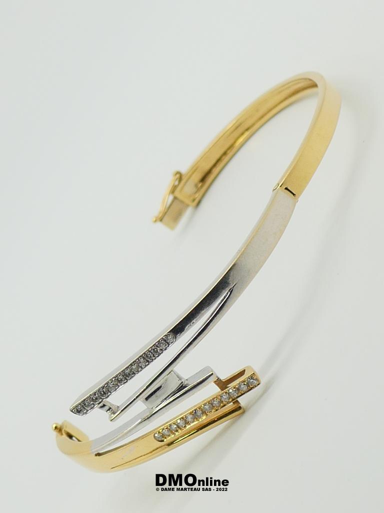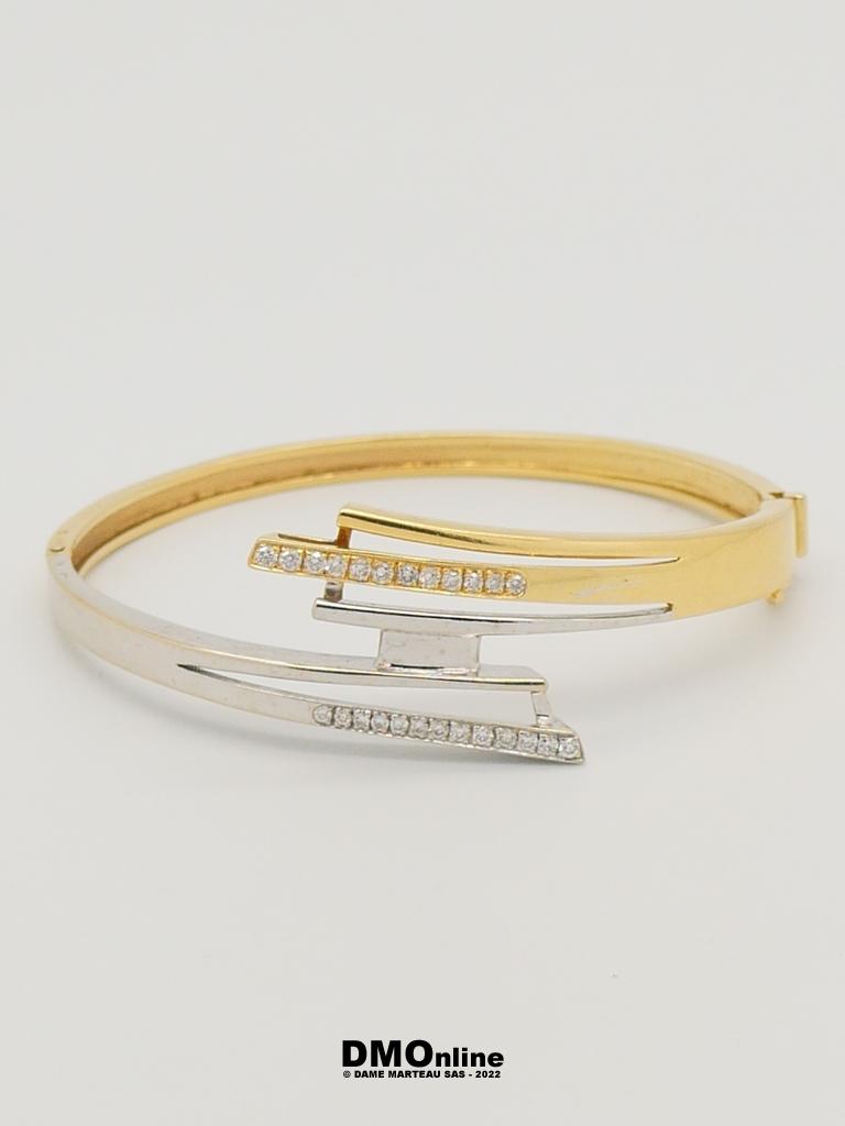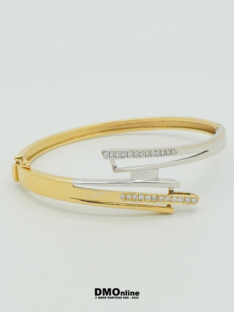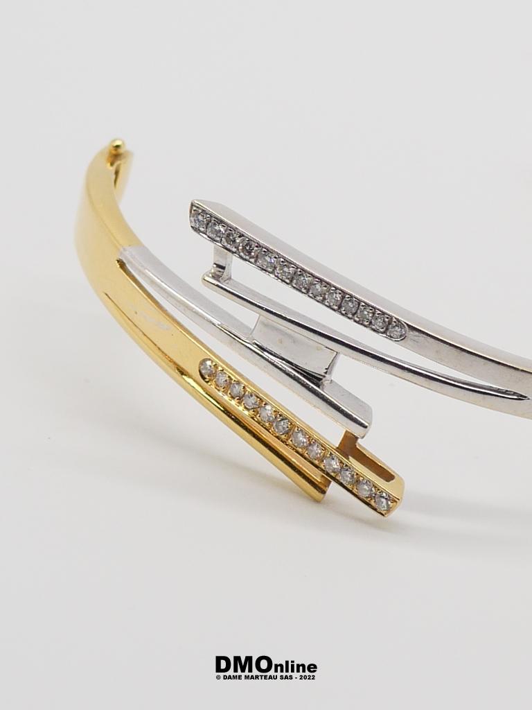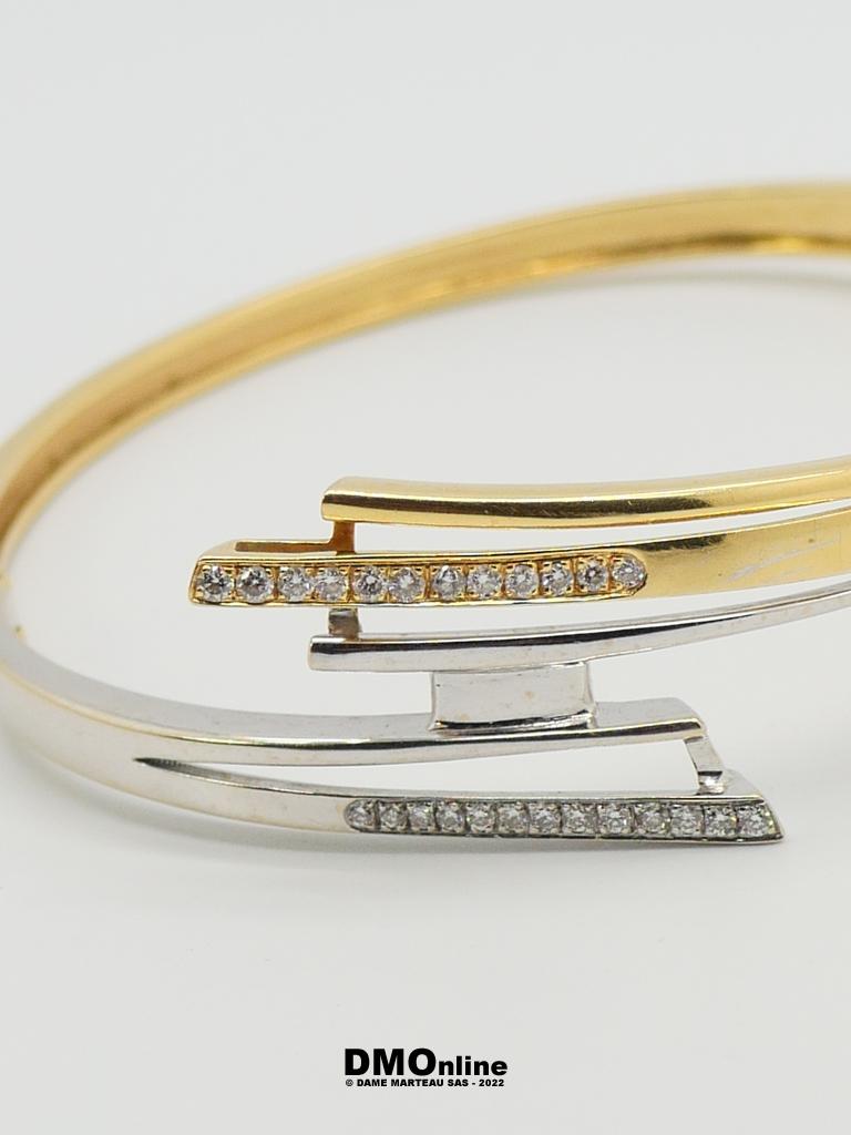 Bracelet jonc articulé en or jaune et or gris 18k serti de 26 diamants totalisant environ 0,40 carats. Bijou de créateur de forme libre. Poids : 26,84 gr