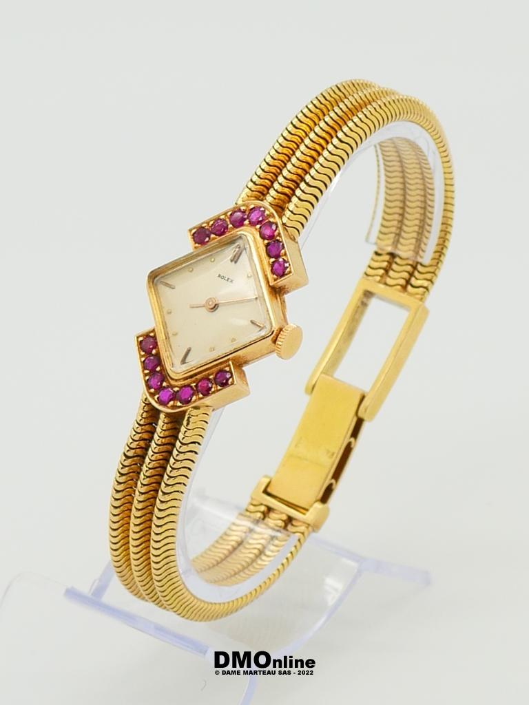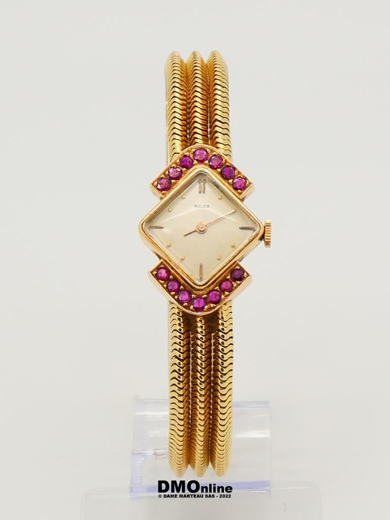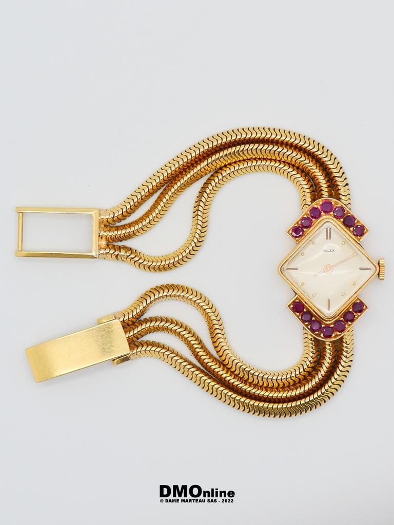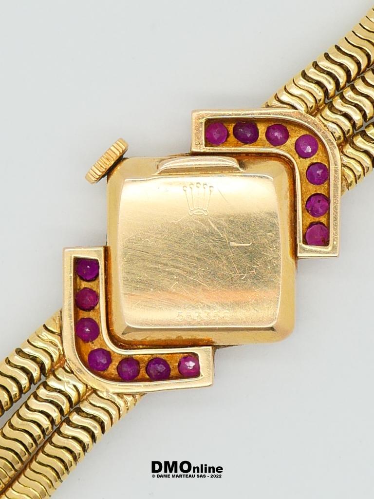 ROLEX. Belle montre bracelet de dame en or jaune numérotée 583356 de 1960. Cadran carré présenté en losange entouré de deux rangées de sept saphirs roses. Mouvement mécanique. Bracelet formé de trois chaines souples. Longueur : 18,5 cm. Poids brut : 46,91 gr. Sans garantie de fonctionnement