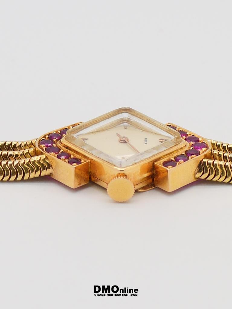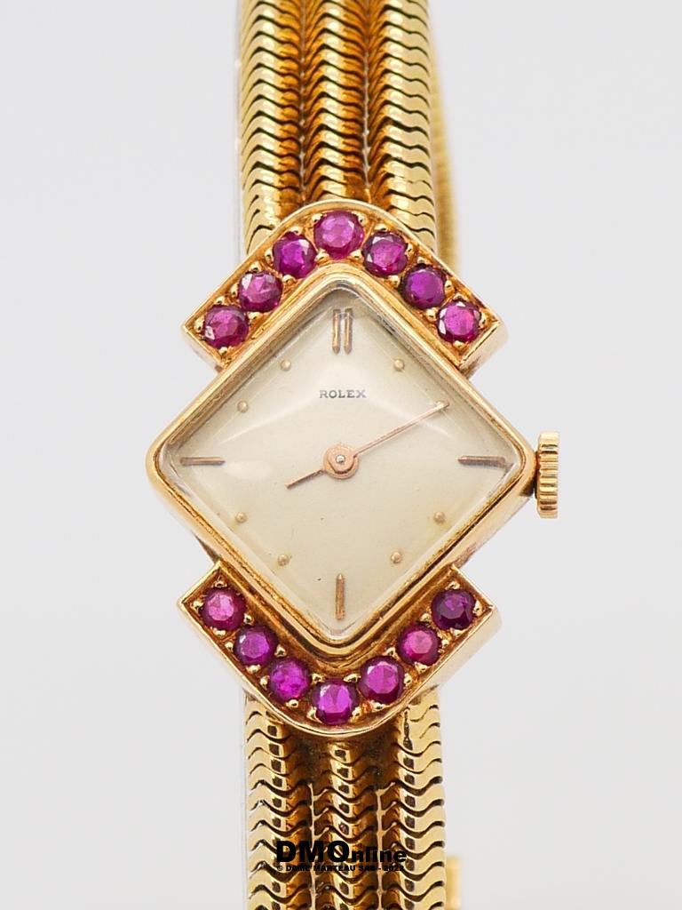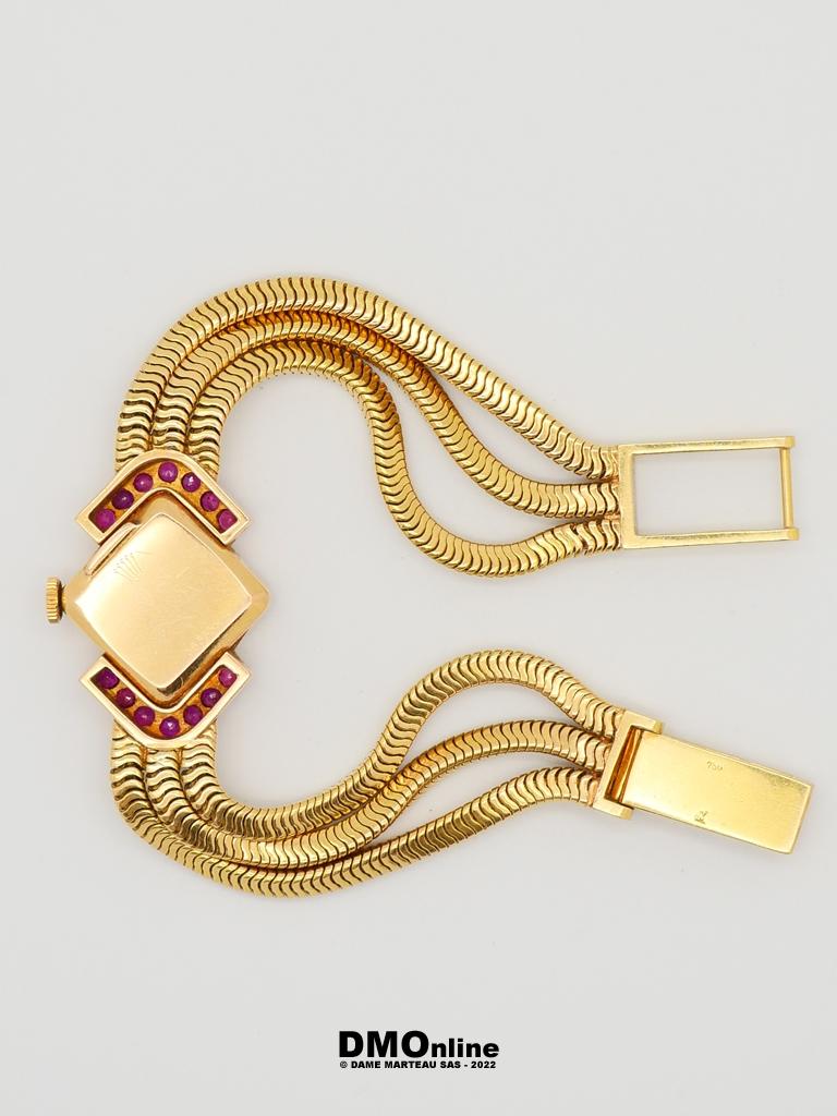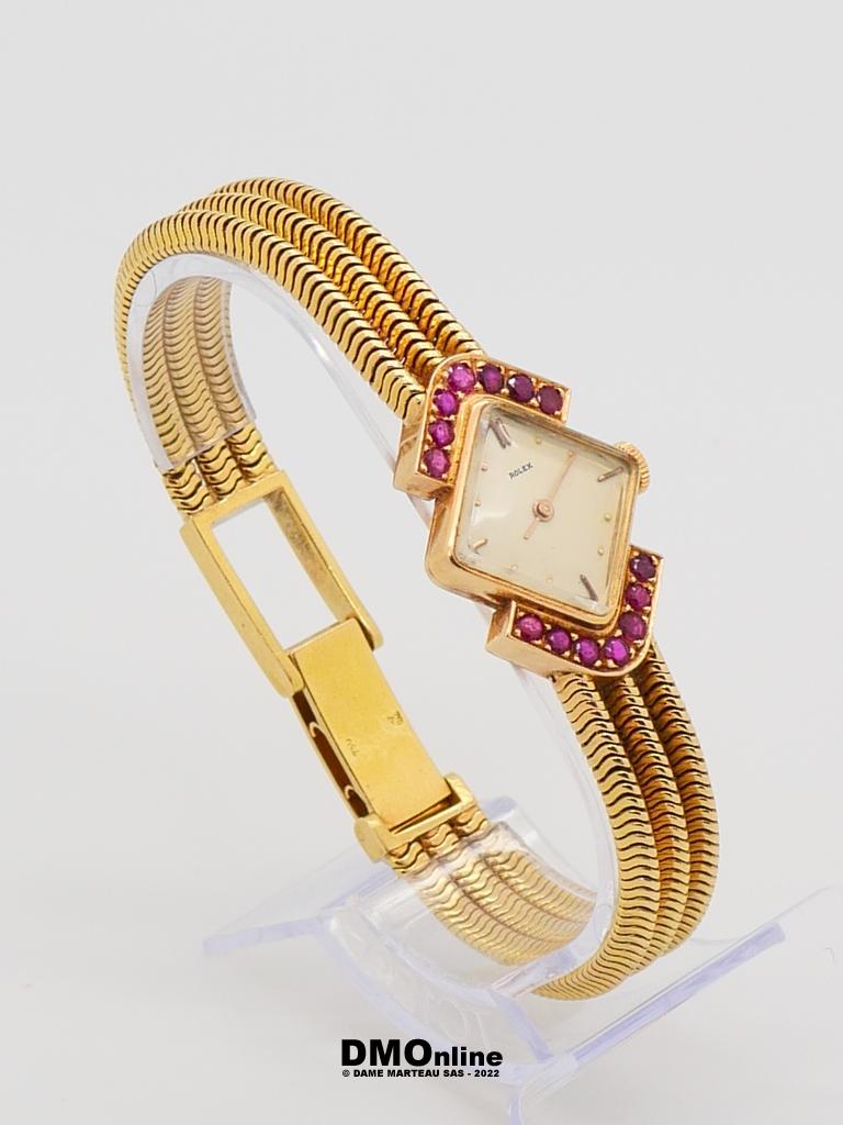 ROLEX. Belle montre bracelet de dame en or jaune numérotée 583356 de 1960. Cadran carré présenté en losange entouré de deux rangées de sept saphirs roses. Mouvement mécanique. Bracelet formé de trois chaines souples. Longueur : 18,5 cm. Poids brut : 46,91 gr. Sans garantie de fonctionnement