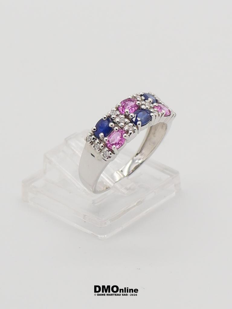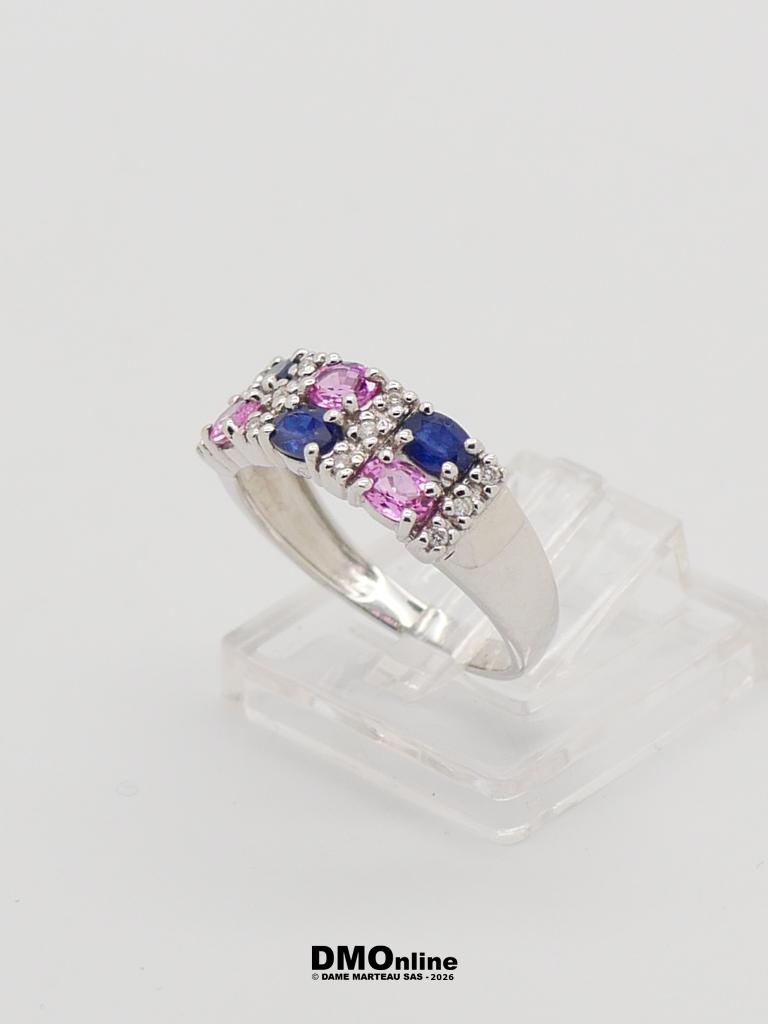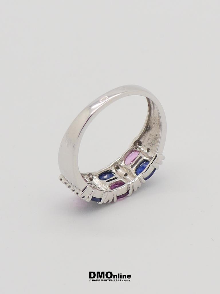 Bague moderne en or blanc 18k sertie alternée de 12 diamants ronds, 3 saphirs bleus ovaux et 3 saphirs roses ovaux. Poids : 3,69 gr. TDD 54.