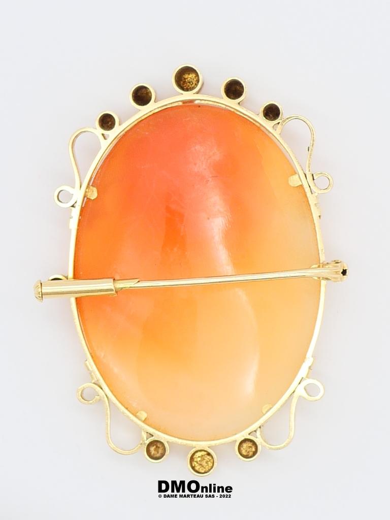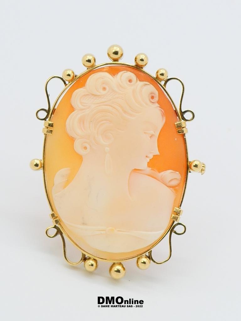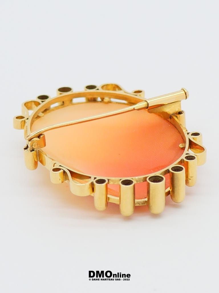 Broche camée à monture en or jaune 18k. Dimensions : 5×3,8 cm. Poids brut : 16 gr
