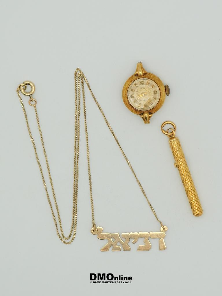 Trois petits bijoux en or jaune comprenant un pendentif en 18k (Poids : 3,22 gr),un boitier de montre en 14k (Poids brut : 5,13 gr) et un collier en 12k (Poids : 2 gr). Poids total brut : 10,35 gr