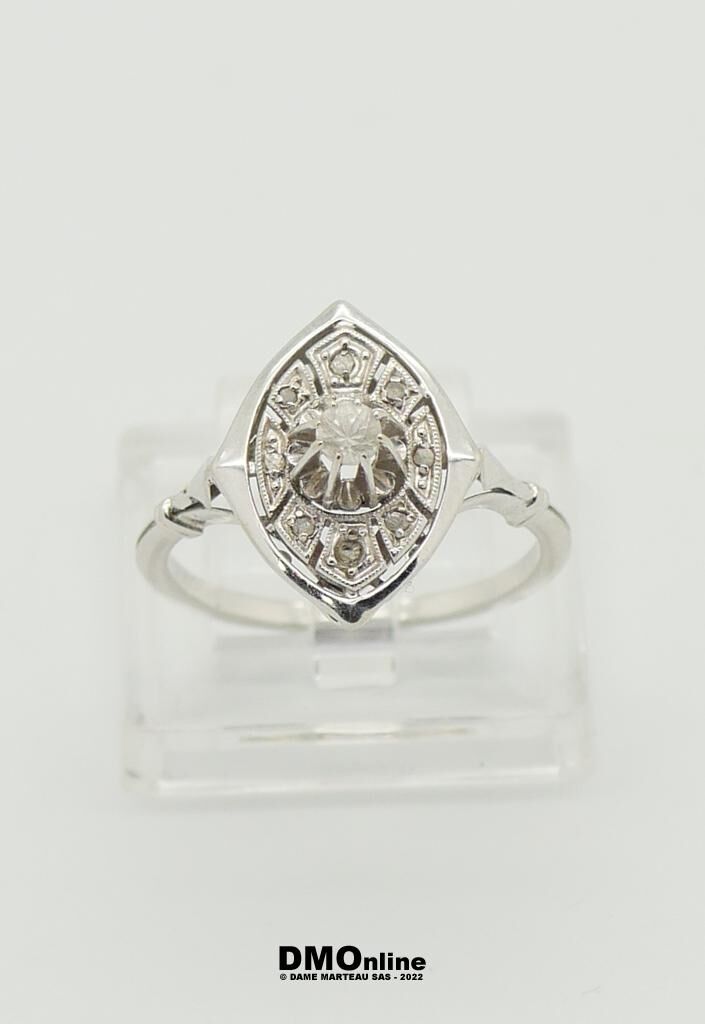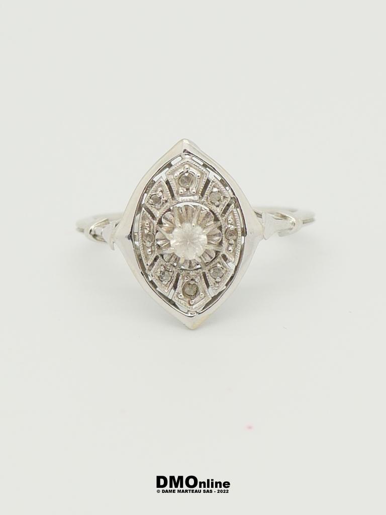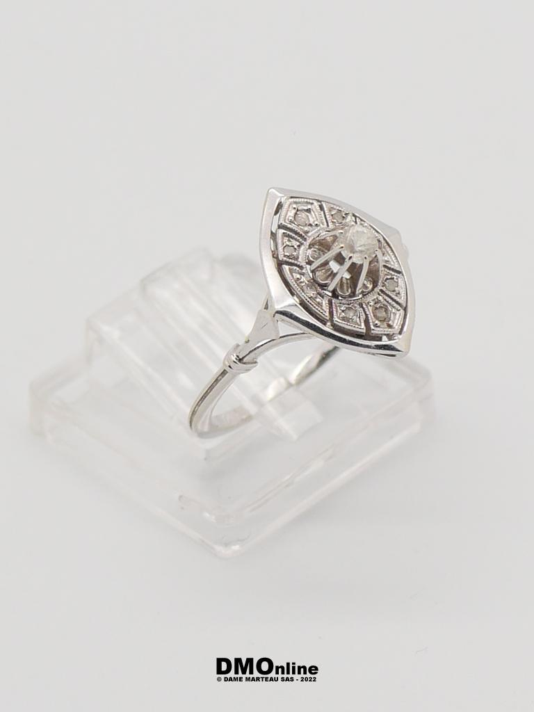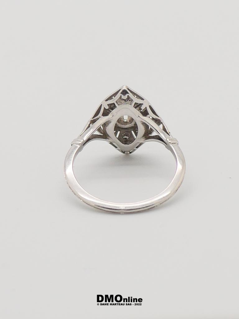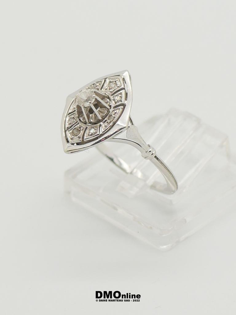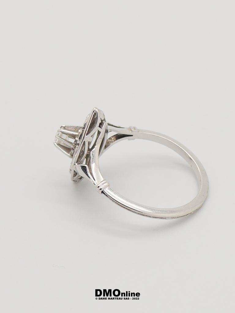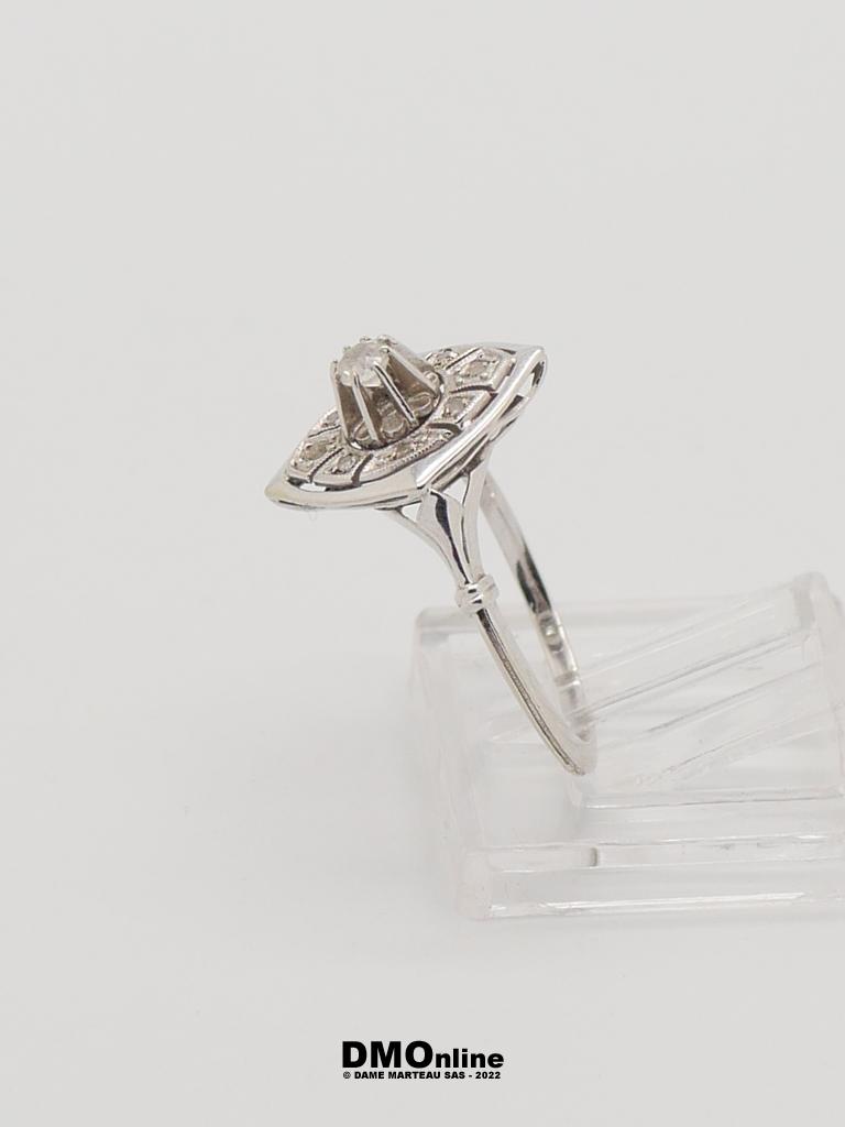 Bague Art Déco en or blanc et platine sertie d’un oxyde de zirconium et de petits diamants taille rose (égrisures). Poids : 2,55 gr. TDD : 52