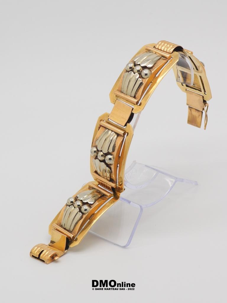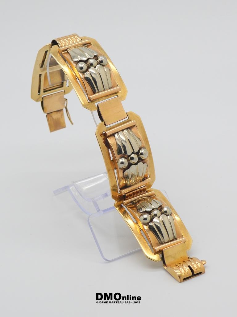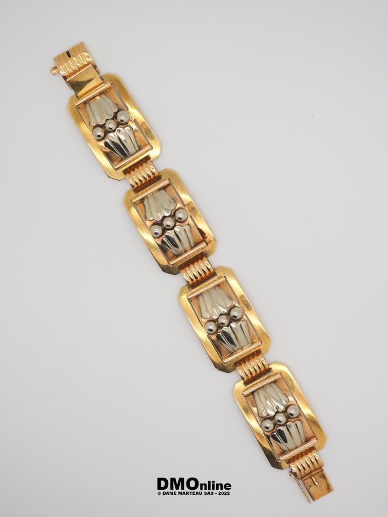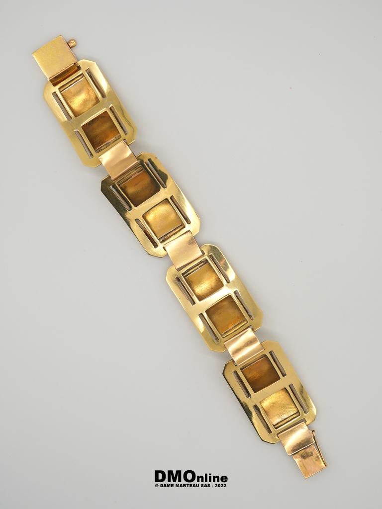 Bracelet Art Déco en or jaune 18k et platine composé de quatre maillons articulés. Longueur : 18 cm. Poids : 64,31 gr