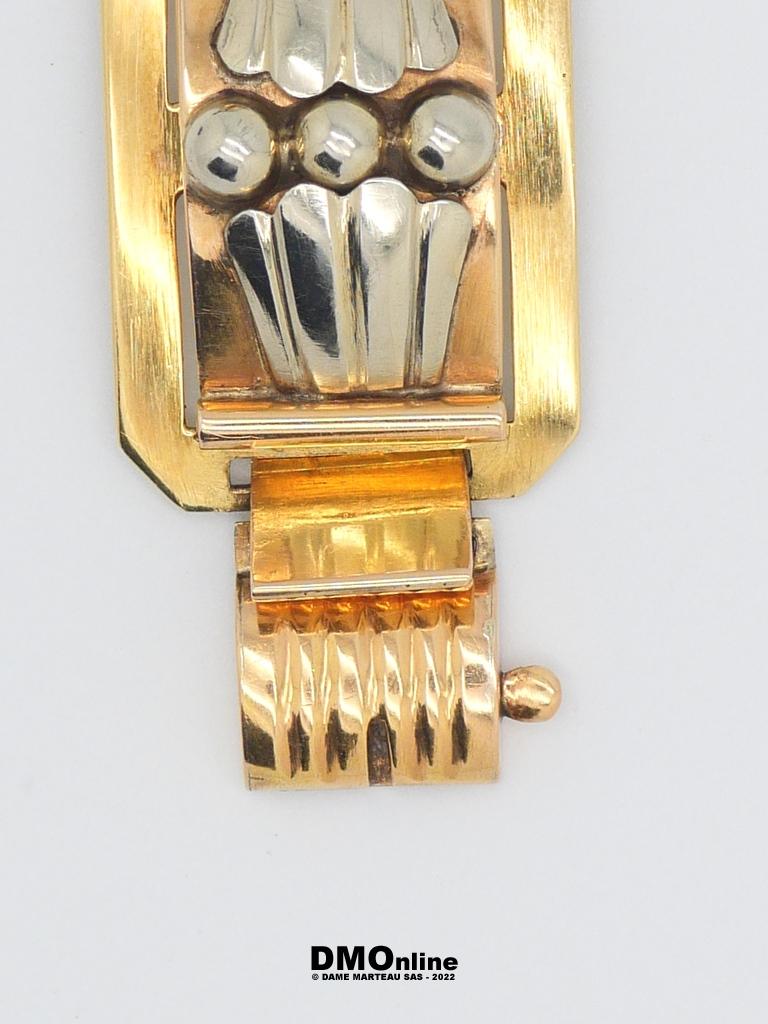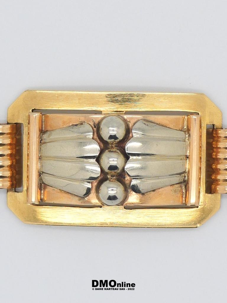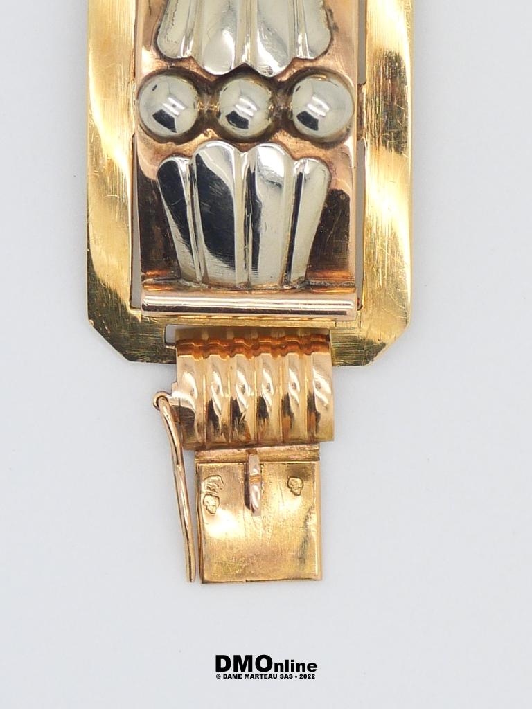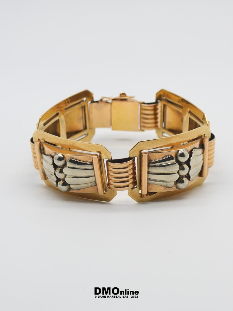 Bracelet Art Déco en or jaune 18k et platine composé de quatre maillons articulés. Longueur : 18 cm. Poids : 64,31 gr