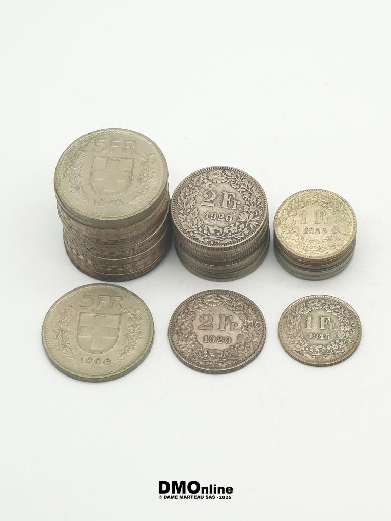 – Dix pièces de 2 Francs Suisse (1920×2, 1941×1, 1944×1, 1957×1, 1963×1, 1968×4). Poids : 94,75 gr