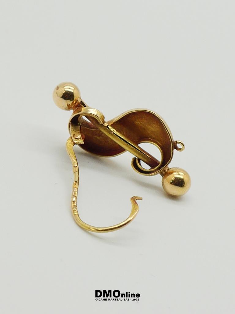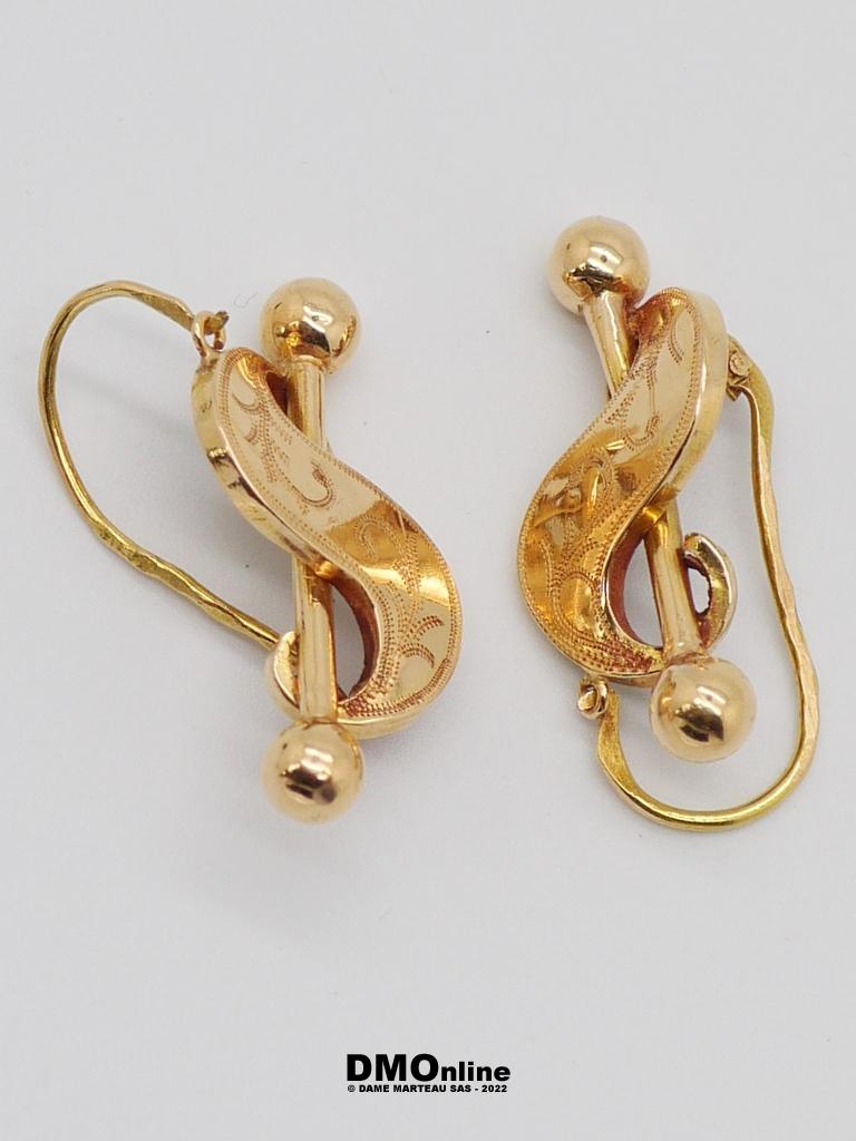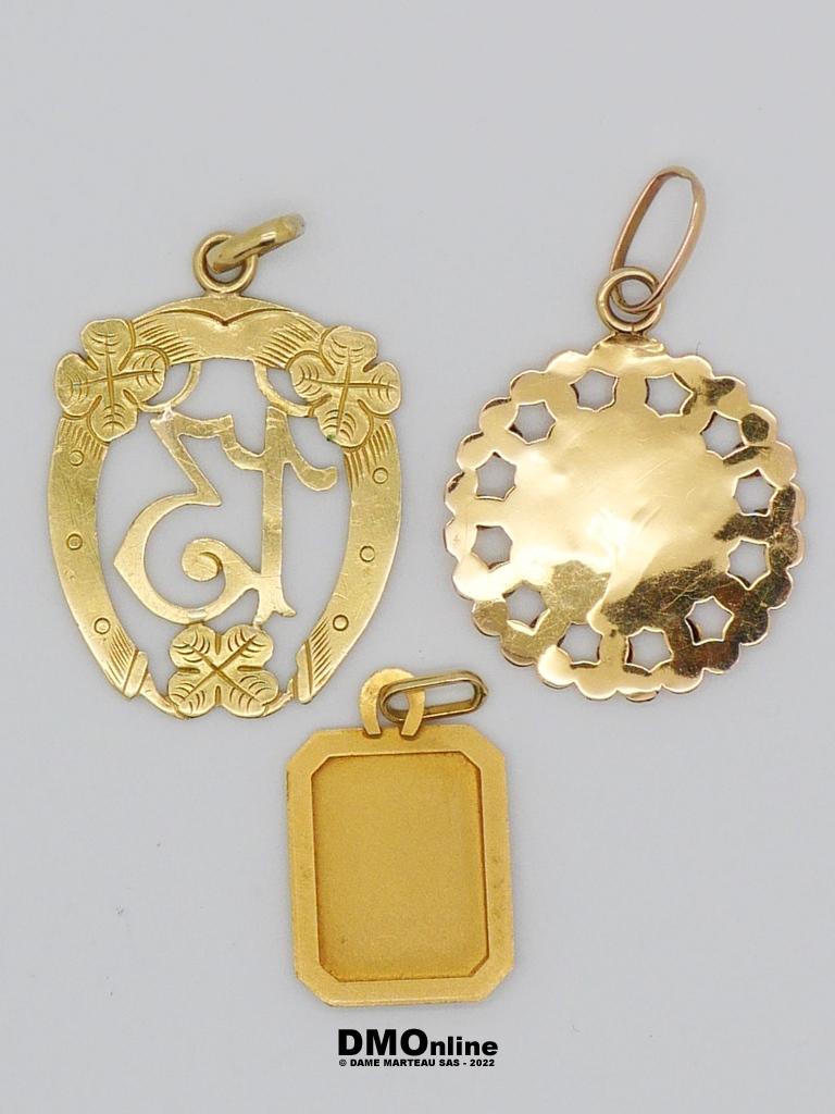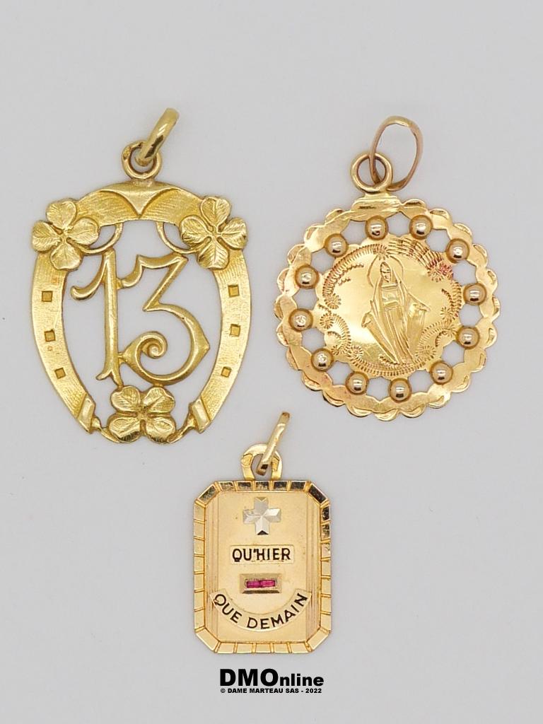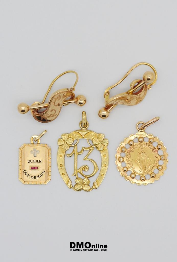 Trois médailles et paire de boucles d’oreilles en or jaune 18k. Poids total : 8,38 gr