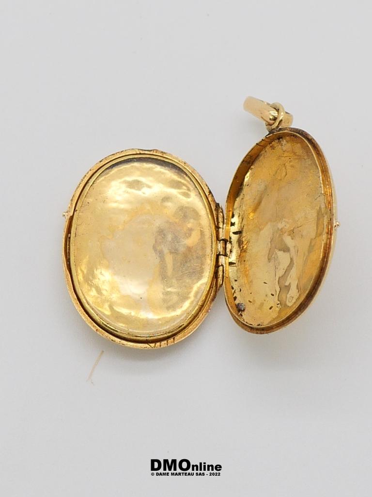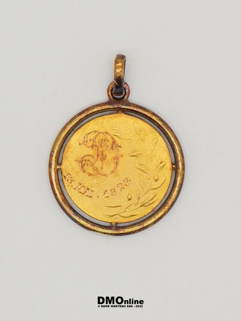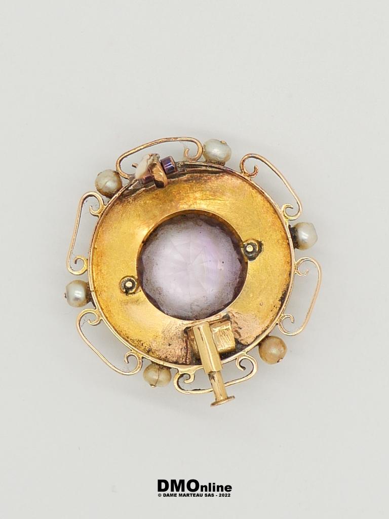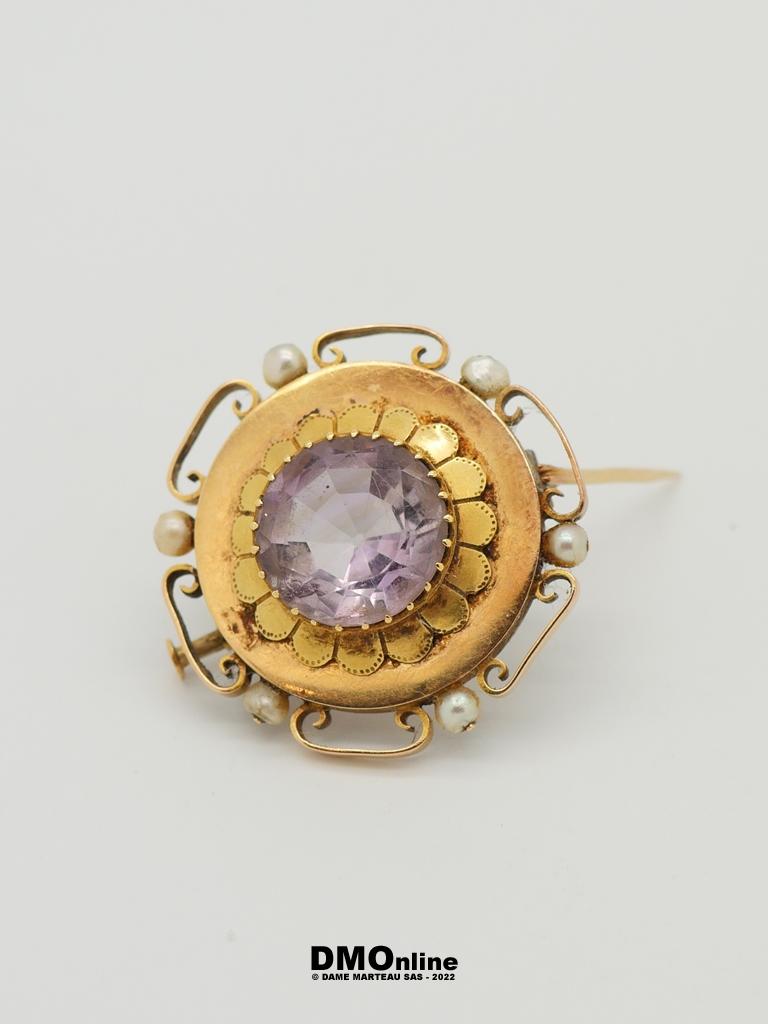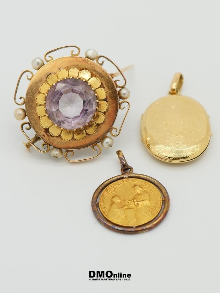 Trois bijoux anciens en l’état en or et en métal doré comprenant une broche ornée d’une pierre de synthèse et de perles, d’une médaille religieuse et d’une cassolette. Poids brut total : 14 gr
