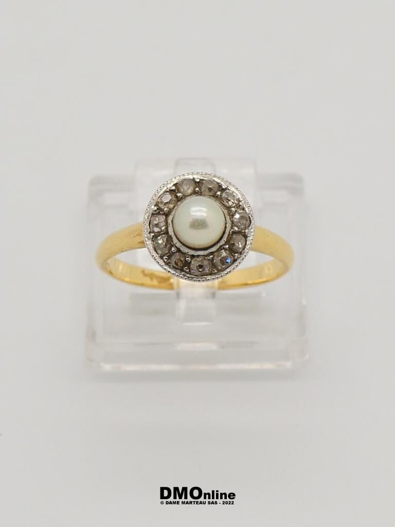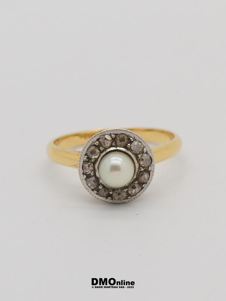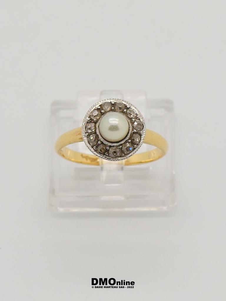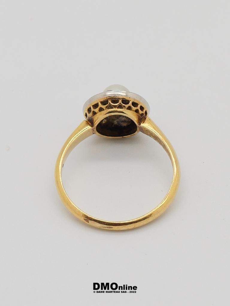 Petite bague ancienne en or jaune 18k ornée d’une perle dans un entourage rond. TDD : 53. Poids brut : 3,25 gr