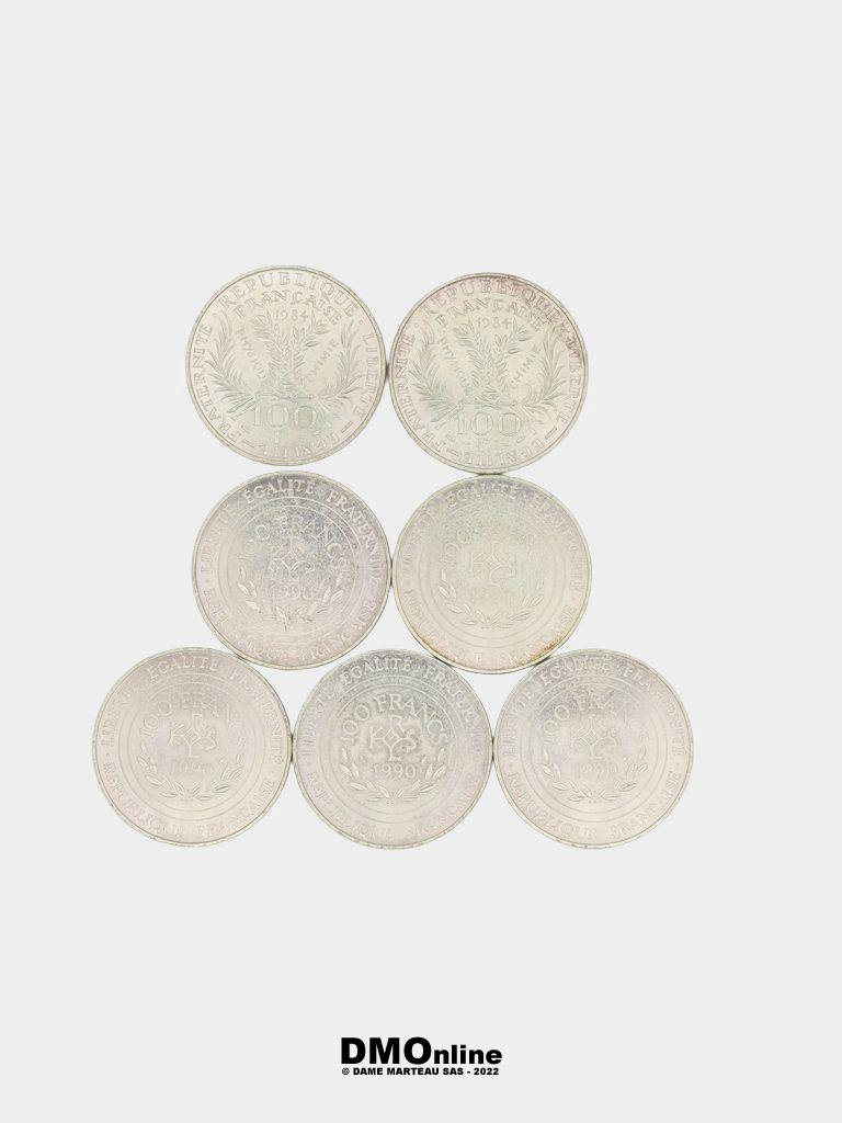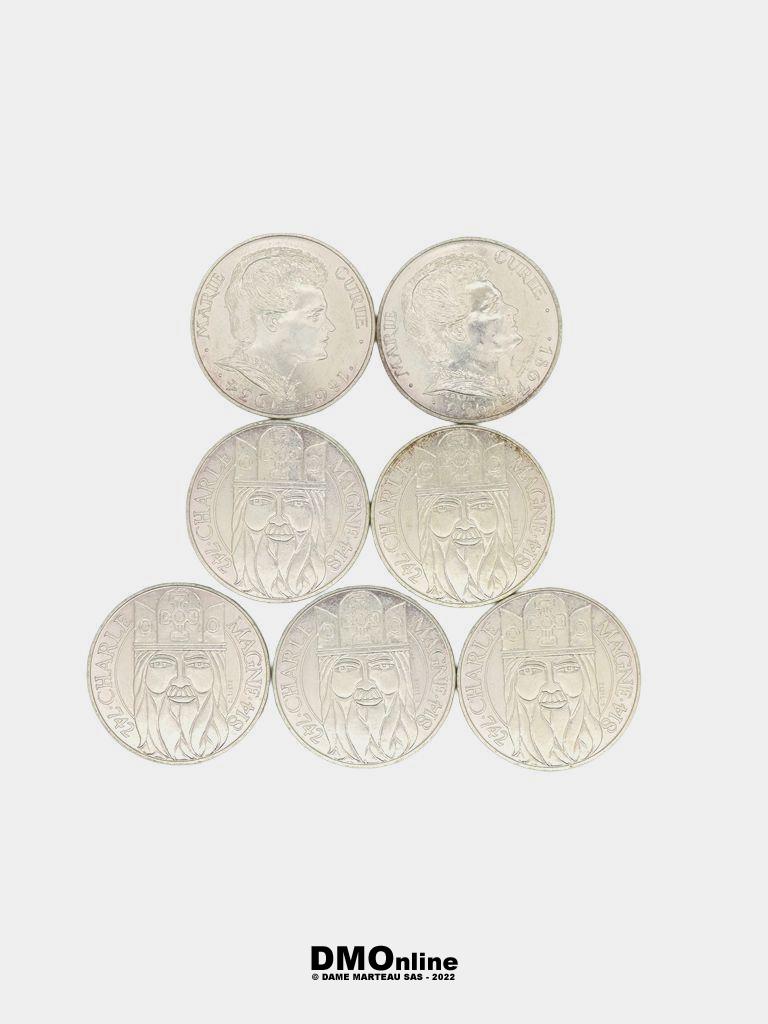 Argent : 7 pièces de 100 francs. Cinq pièces Charlemagne de 1990 et deux pièces Marie Curie de 1984. Poids : 105,19 gr