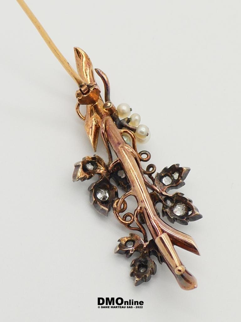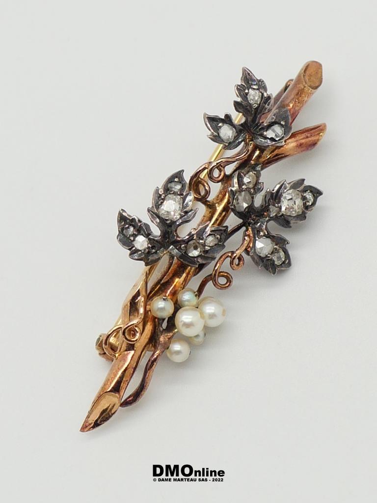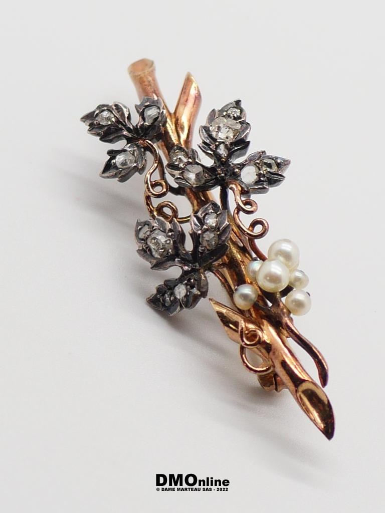 Broche ancienne à représentation d’une branche en or ornée de roses et de perles. Dimensions : 5×1,5 cm. Poids brut : 6,21 gr
