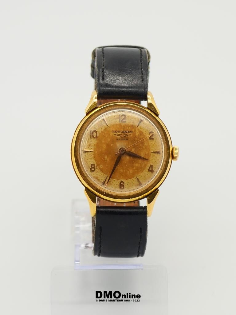LONGINES. Boitier de montre en or jaune 18k. Cadran Champagne taché. Diamètre du cadran : 3,4 cm. Bracelet cuir rapporté. Poids brut : 37,38 gr