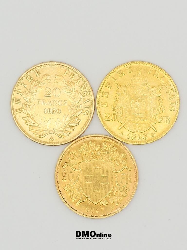 Trois pièces en or dont deux françaises de 20 francs (1859 et 1866) et une pièce suisse de 20 francs (1947). Poids total : 19,32 gr