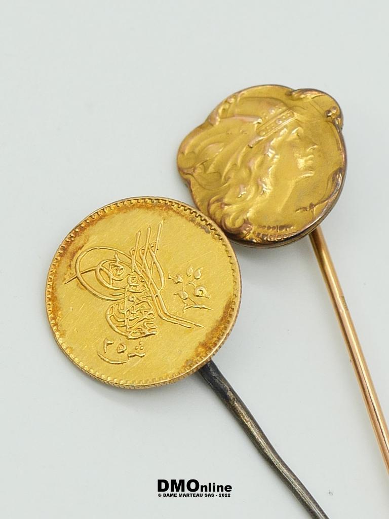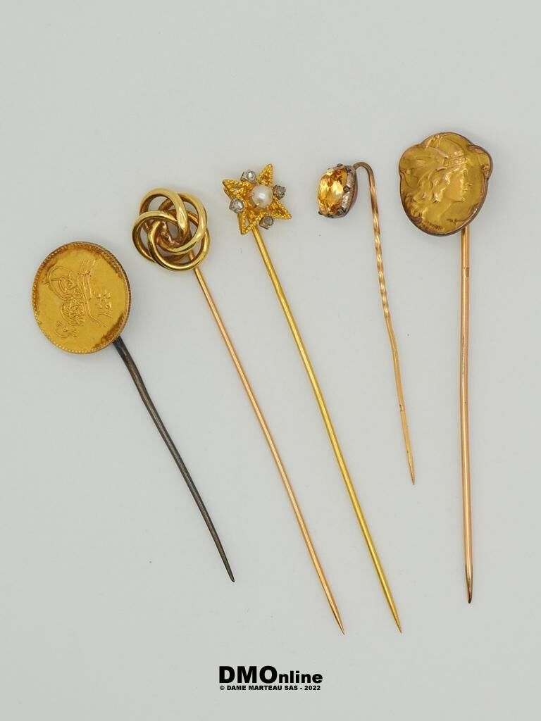 Cinq épingles. Deux épingles en or jaune 18k dont l’une ornée d’une petite perle (Poids brut : 2,44 gr). Une épingle en métal présentant une pièce turque en or (Poids brut : 2,71 gr). Deux épingles en métal.