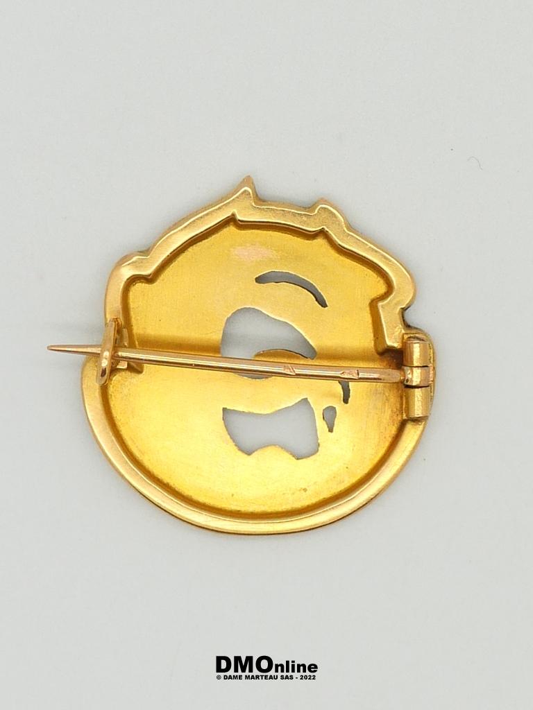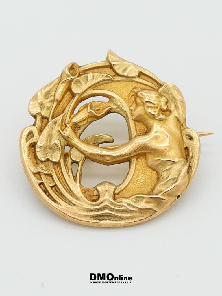 Broche Art Nouveau en or jaune 18k à décor d’un buste de femme dans un décor de nymphéas. Diamètre : 2,4 cm. Poids : 2,27 gr
