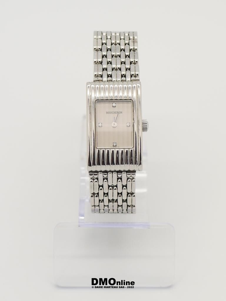 BOUCHERON. Montre dame à cadran en acier présentant quatre diamants totalisant environ 0,02 carat disposé aux heures cardinales. Bracelet en acier et deux bracelets en cuir dont un en autruche. Année 2001. Dans son coffret d’origine. Poids brut : 791 g.