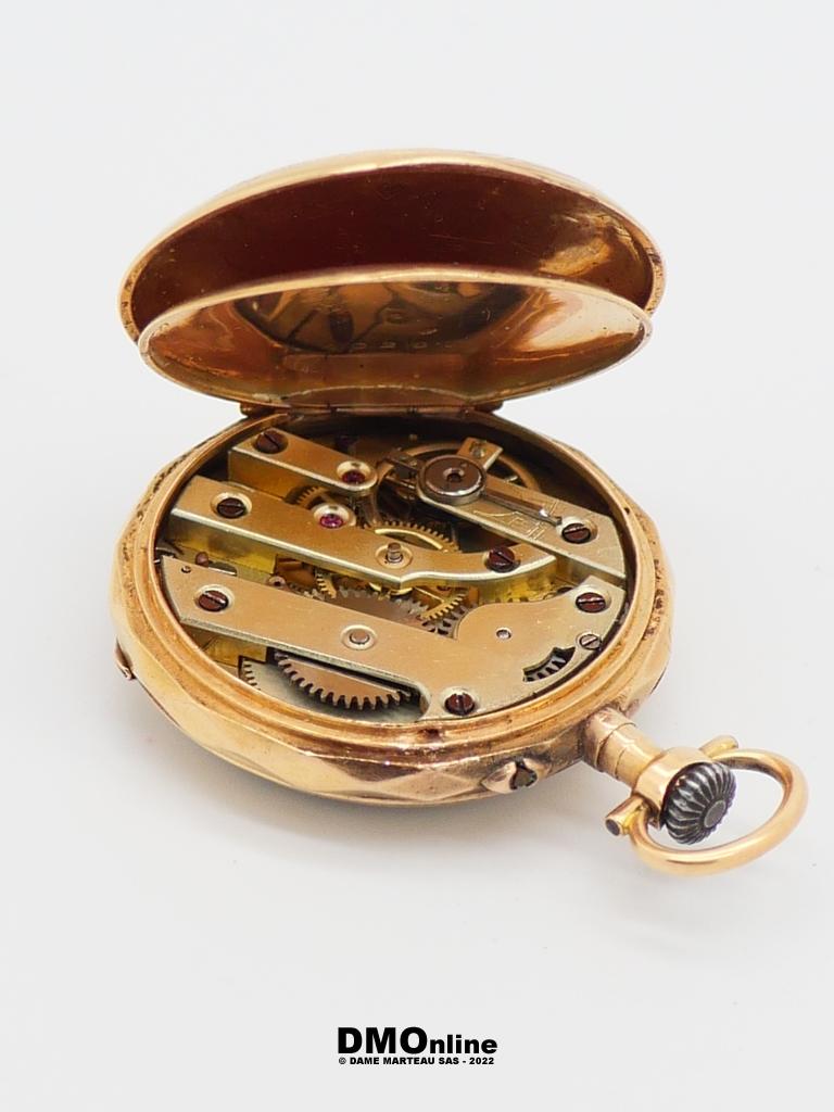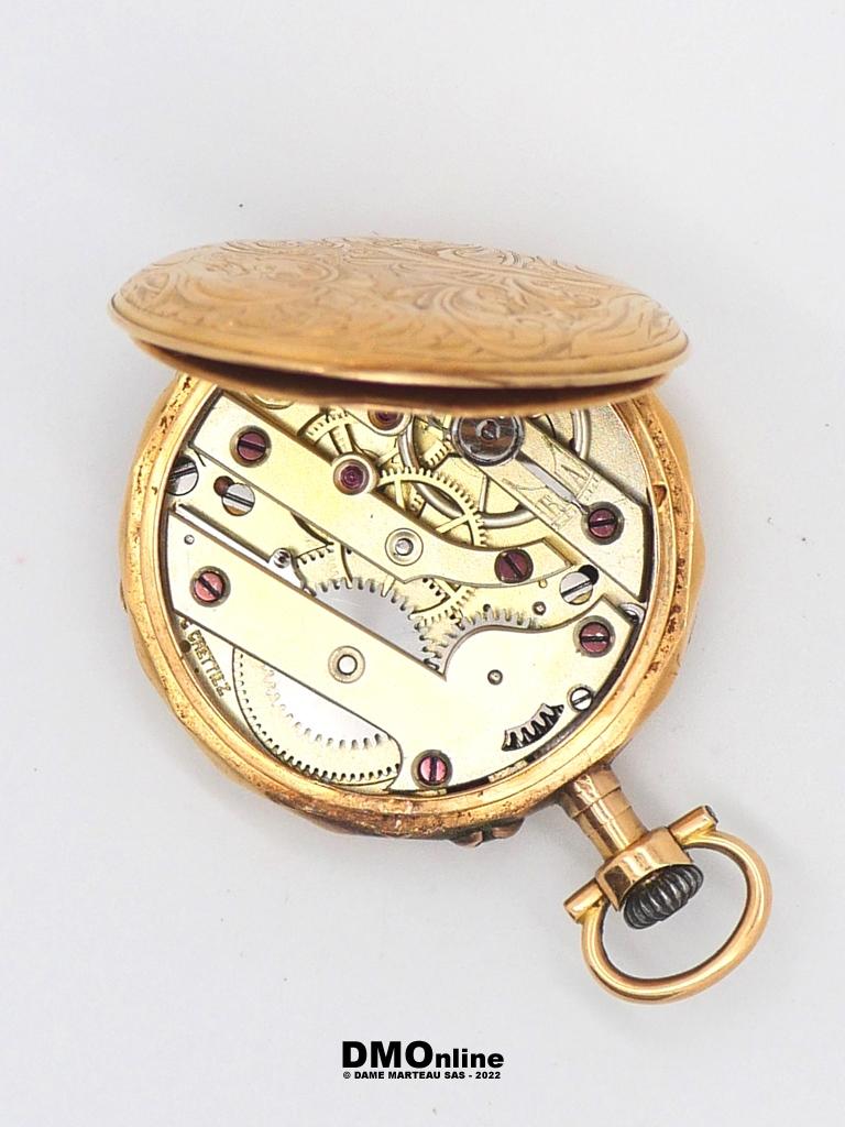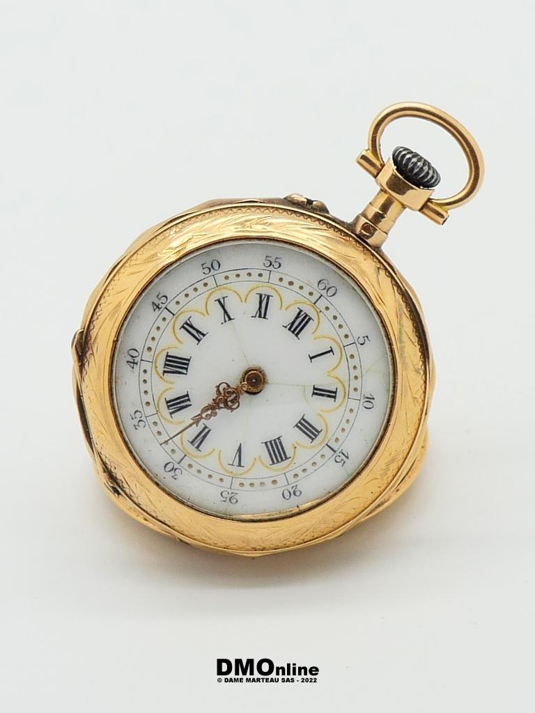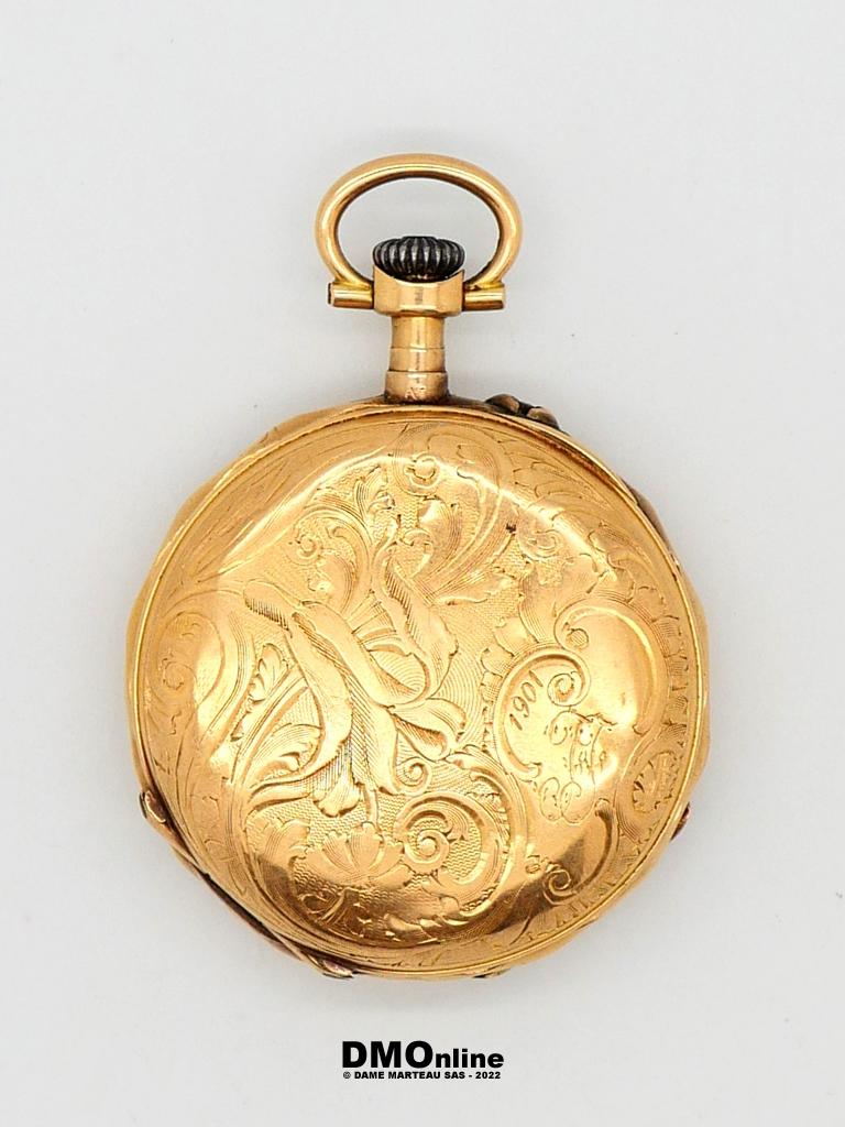 Montre de col en or à double clapet en or. Bélière en métal. Dos cidelé de rinceaux et daté 1901. Diamètre : 3,3 cm. Poids brut : 23,73 gr